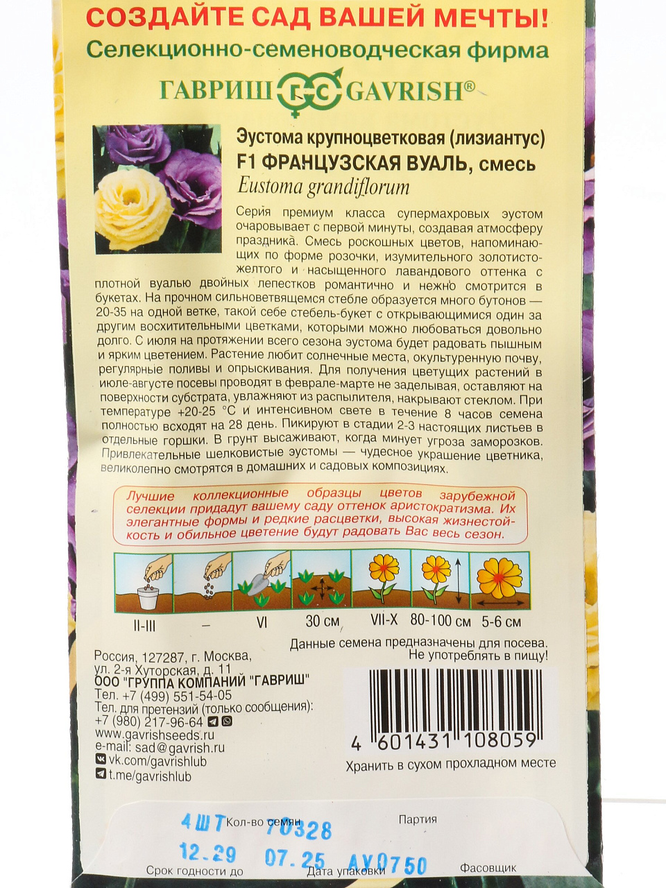 Семена Цветы, Эустома, Французская вуаль F1, 4 шт, Элитная клумба, крупноцветная, гранулы, пробирка, цветная упаковка, Гавриш