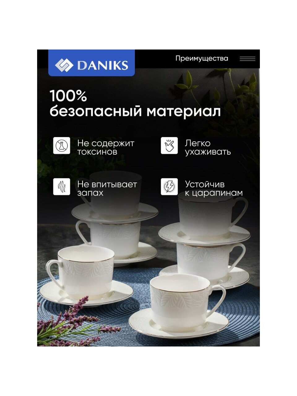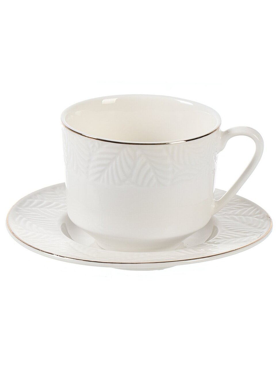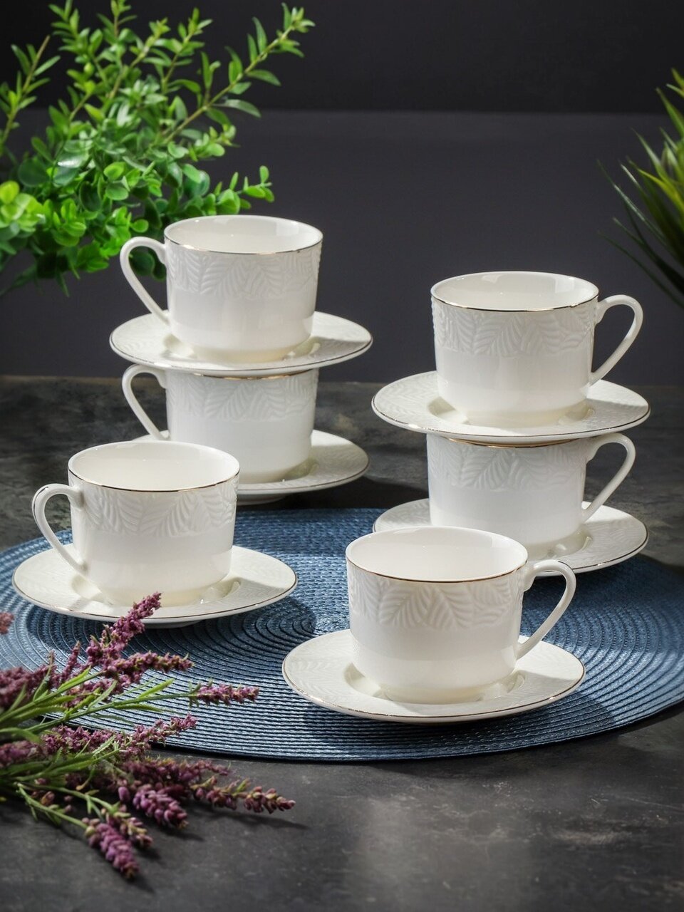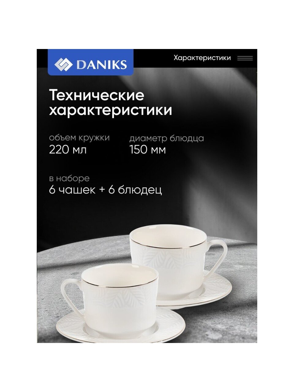 Набор чайный керамика, 12 предметов, на 6 персон Daniks «Листья» — это гармония классического стиля и современных требований к сервировке. Благодаря подарочной упаковке и изысканному узору с золотой каймой, такой комплект станет удачным решением как для личного чаепития, так и для подарка. Если вы ищете, какой чайный набор лучше выбрать для семьи или на подарок, обратите внимание на сочетание прочной керамики и удобного объёма чашек: 220 мл оптимальны для классического чая и кофе.