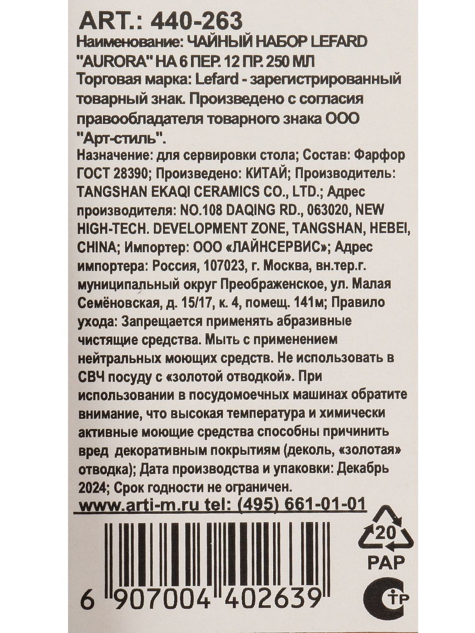 Вы можете приобрести «Набор чайный фарфор, 12 предметов, на 6 персон, 250 мл, Lefard, Aurora, 440-263, подарочная упаковка» и другие товары в нашем интернет-магазине в Липецке по низким ценам и с бесплатным самовывозом.