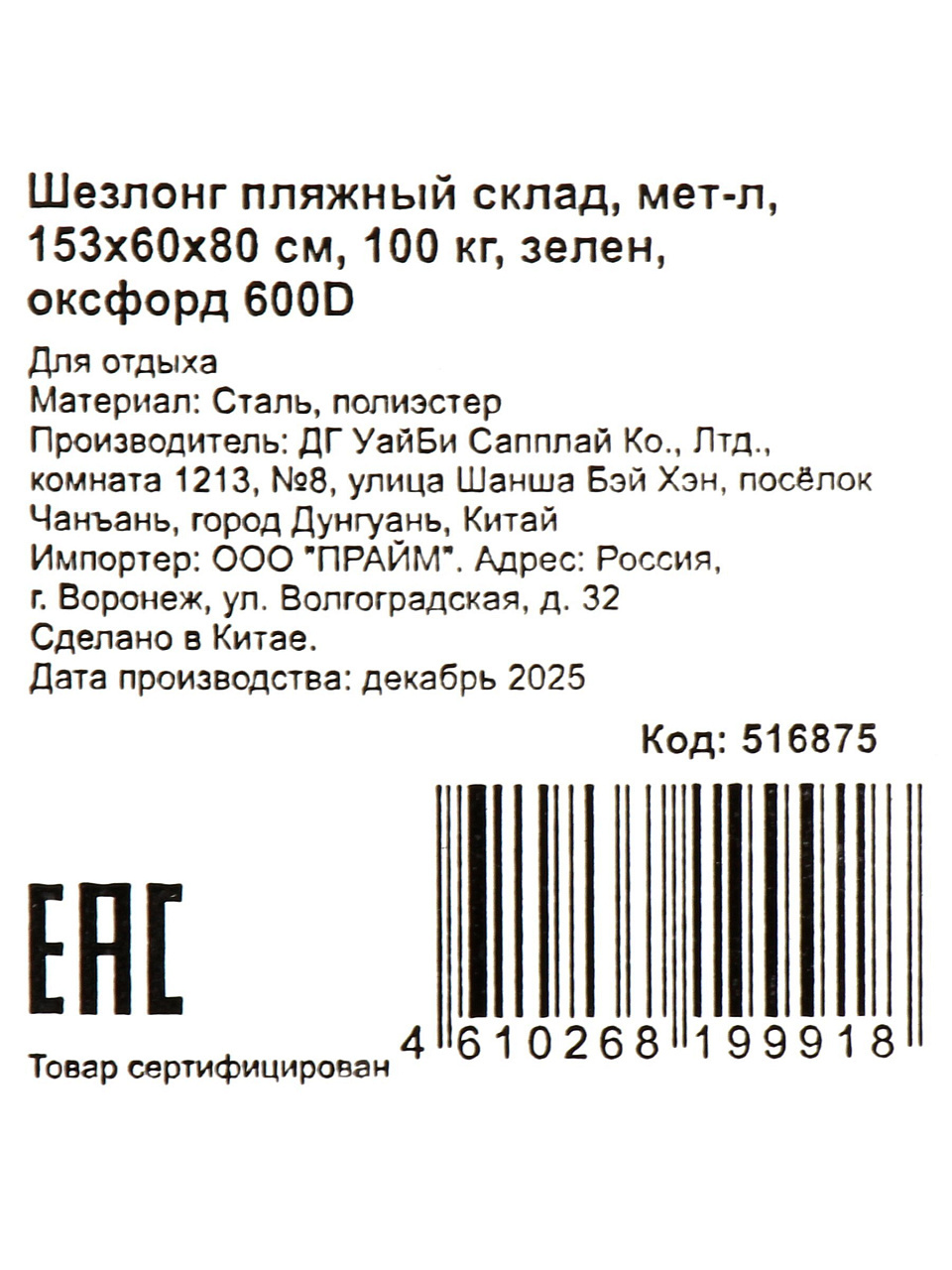 Шезлонг пляжный складной 153×60×80 см, металл, оксфорд 600D: удобство отдыха на даче и пляже без компромиссов по цене и комфорту.