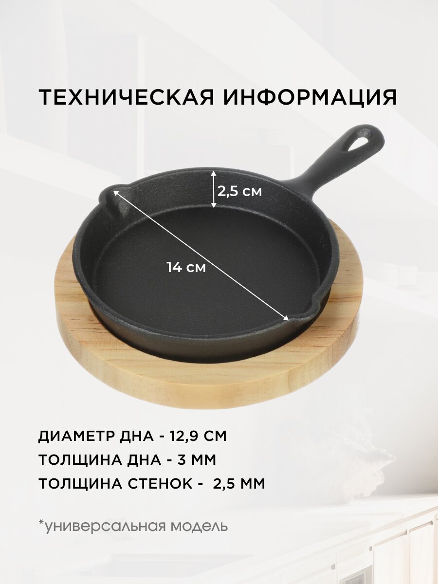 - Оптимальный размер 14 см, литой чугун толщиной 3 мм дна и 2,5 мм стенок — равномерный нагрев, долгий срок службы