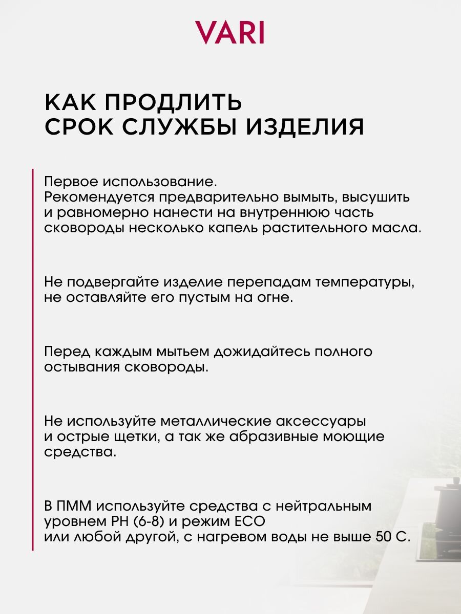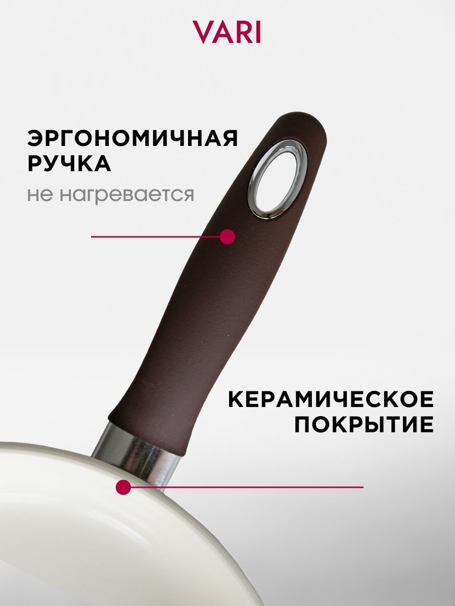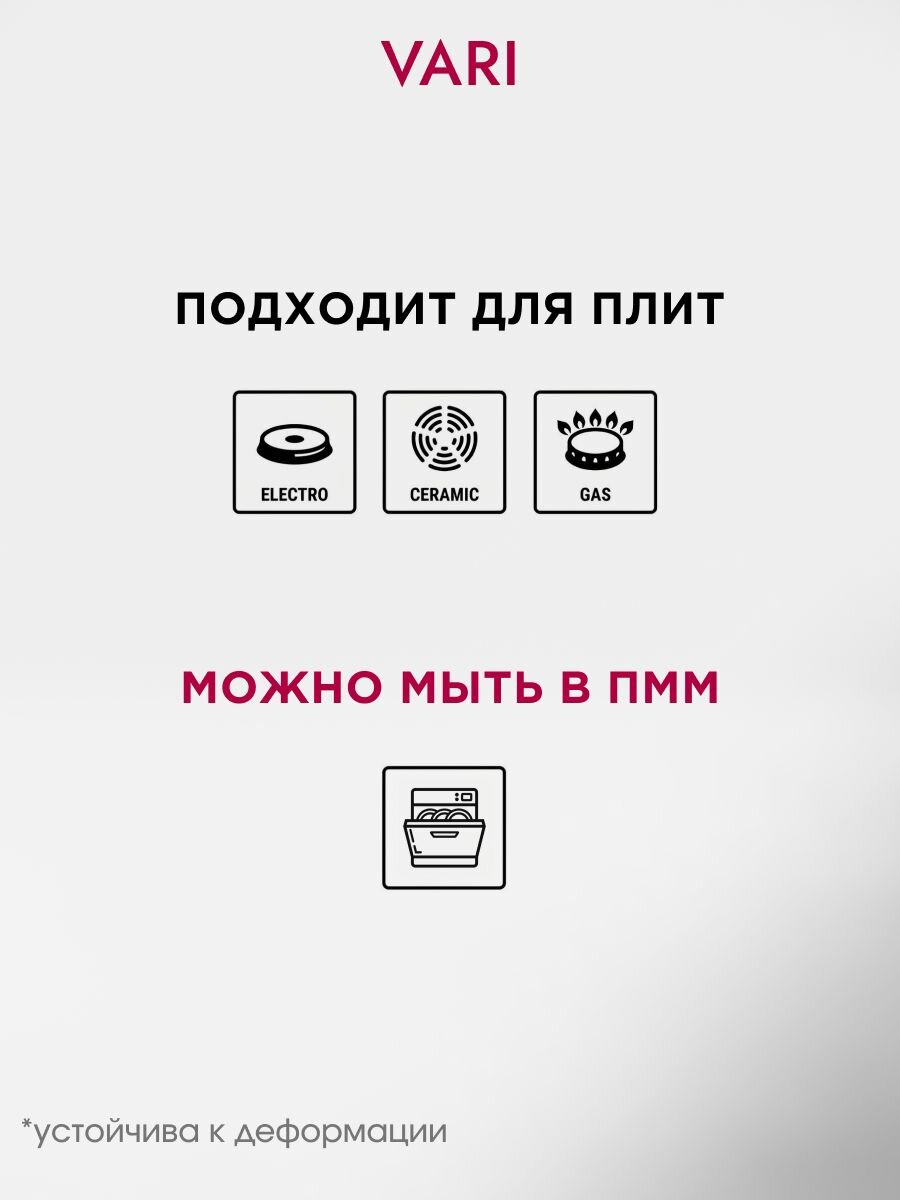 Если вы ищете, чем отличается литая алюминиевая сковорода от обычной, обратите внимание: литой алюминий обеспечивает более равномерный нагрев по сравнению с штампованными аналогами, а керамическое покрытие экологично и безопасно. Сковорода Vari Fresco Ceramica легко моется в посудомоечной машине, не требует специальных средств и не впитывает запахи. Не подходит для индукционных плит — это важно учесть при выборе.
