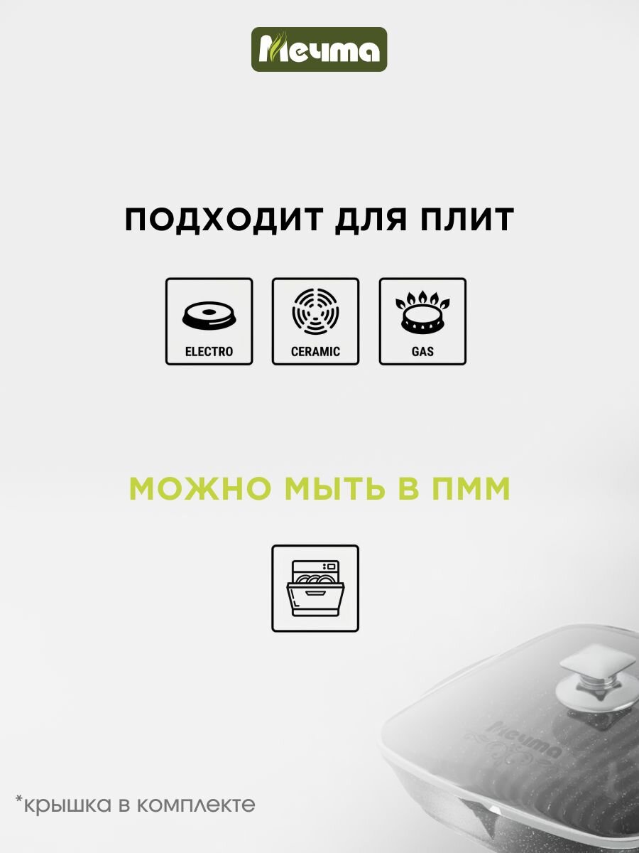 Модель Мечта Гранит 28 см — оптимальный вариант, если вы решаете, какую сковороду-гриль выбрать для семьи: квадратная форма вмещает больше продуктов, а высокая бортовая часть (53 мм) делает сковороду глубокой и удобной для стейков, овощей, курицы. Съемная ручка экономит место на хранении и позволяет использовать сковороду в духовке. В отличие от дешевых аналогов, здесь толщина дна 6 мм и стенок 4 мм, что исключает подгорание и обеспечивает стабильную температуру.