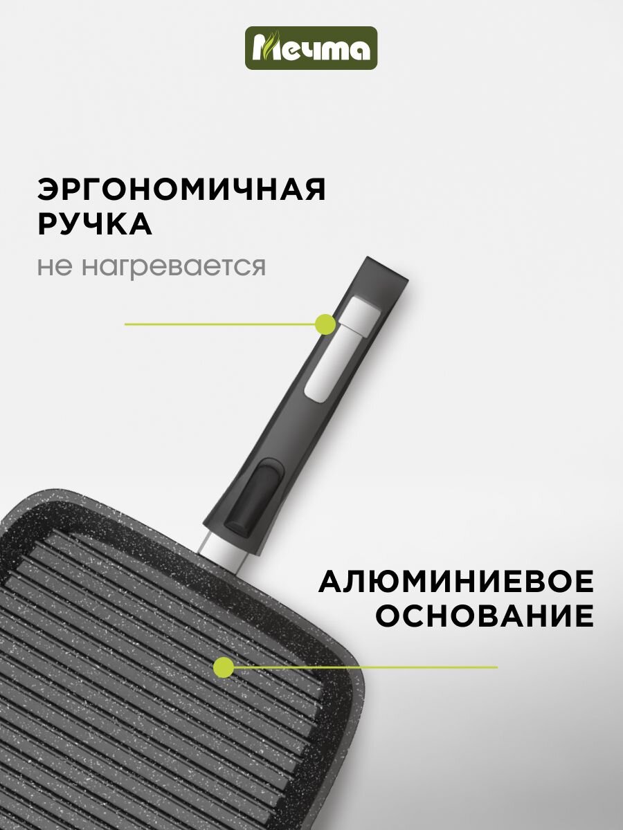 Сковорода-гриль Мечта Гранит — выбор для тех, кто ищет, какую сковороду-гриль купить недорого для дачи или дома и не хочет жертвовать качеством. Благодаря литому алюминию и рифленому дну блюда приобретают ярко выраженный гриль-рисунок и сохраняют сочность. Антипригарное каменное покрытие нового поколения позволяет готовить без масла и легко мыть изделие даже в посудомоечной машине. Часто спрашивают: "Чем отличается литая сковорода-гриль от обычной?" — литой корпус обеспечивает отсутствие деформации, равномерный прогрев и долгий срок службы.