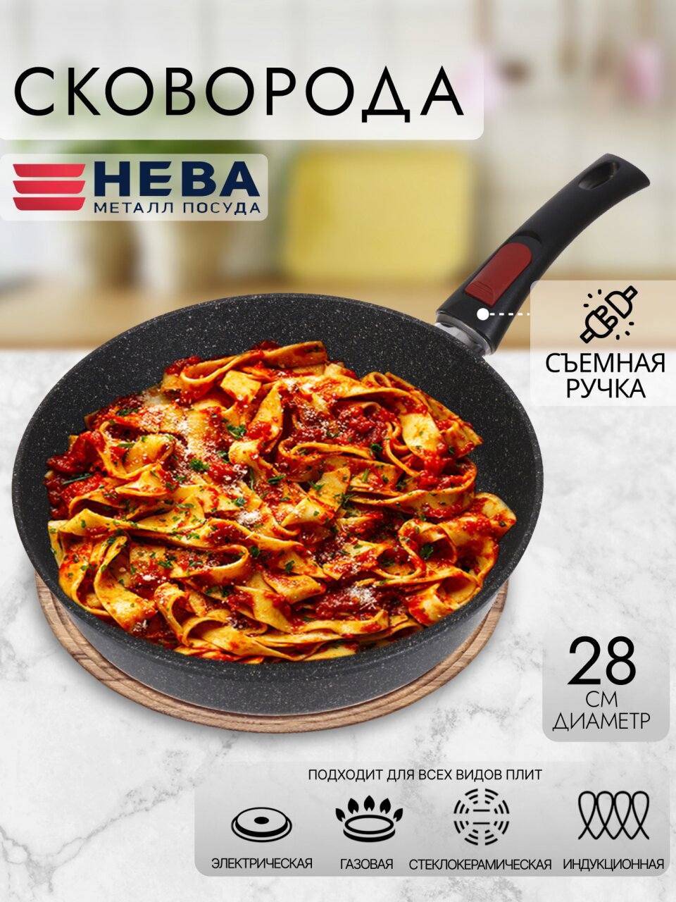 Сковорода литой алюминий 28 см Нева Металл Посуда: антипригарное гранитное покрытие, съемная ручка, подходит для индукции и посудомойки.