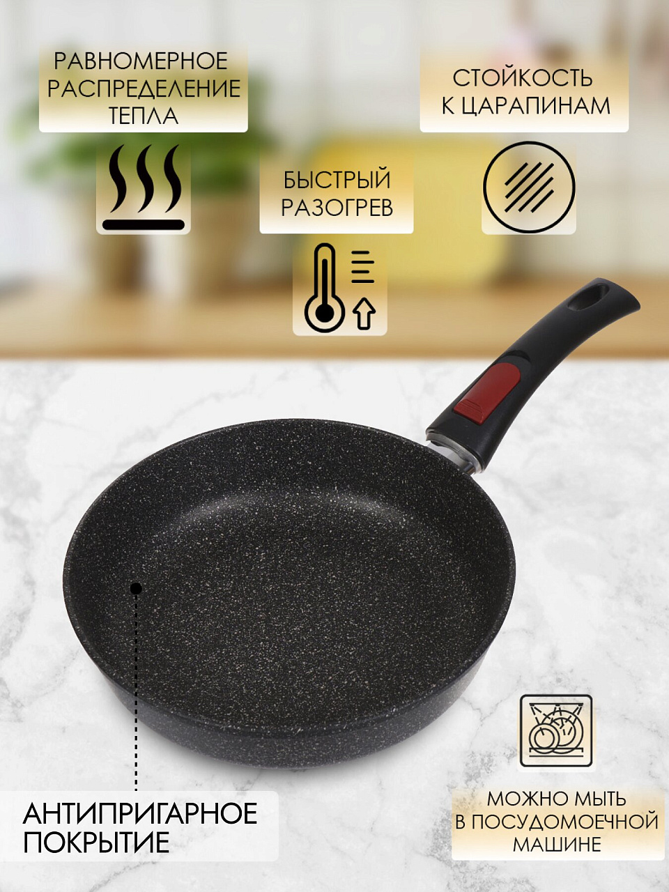 Сковорода из литого алюминия с гранитным антипригарным покрытием — идеальное решение для тех, кто ищет, какую сковороду выбрать для ежедневной готовки. Благодаря толщине дна 6,8 мм и стенок 2,9 мм, тепло распределяется равномерно, что предотвращает пригорание и экономит энергию. Съемная ручка облегчает хранение и позволяет использовать сковороду в духовке — вы можете жарить, тушить, запекать блюда для всей семьи.