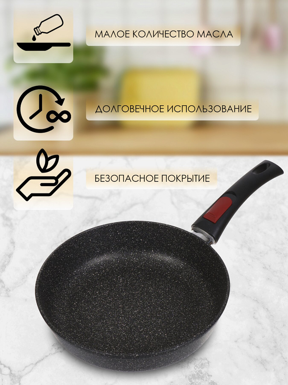 - Гранитное антипригарное покрытие нового поколения — блюда не прилипают, легко моется, безопасно для здоровья