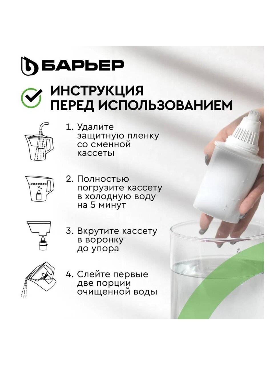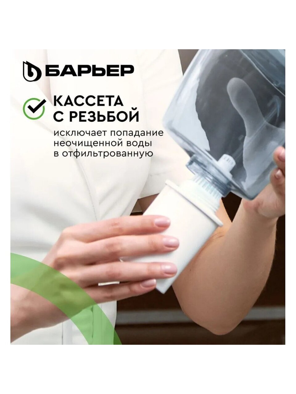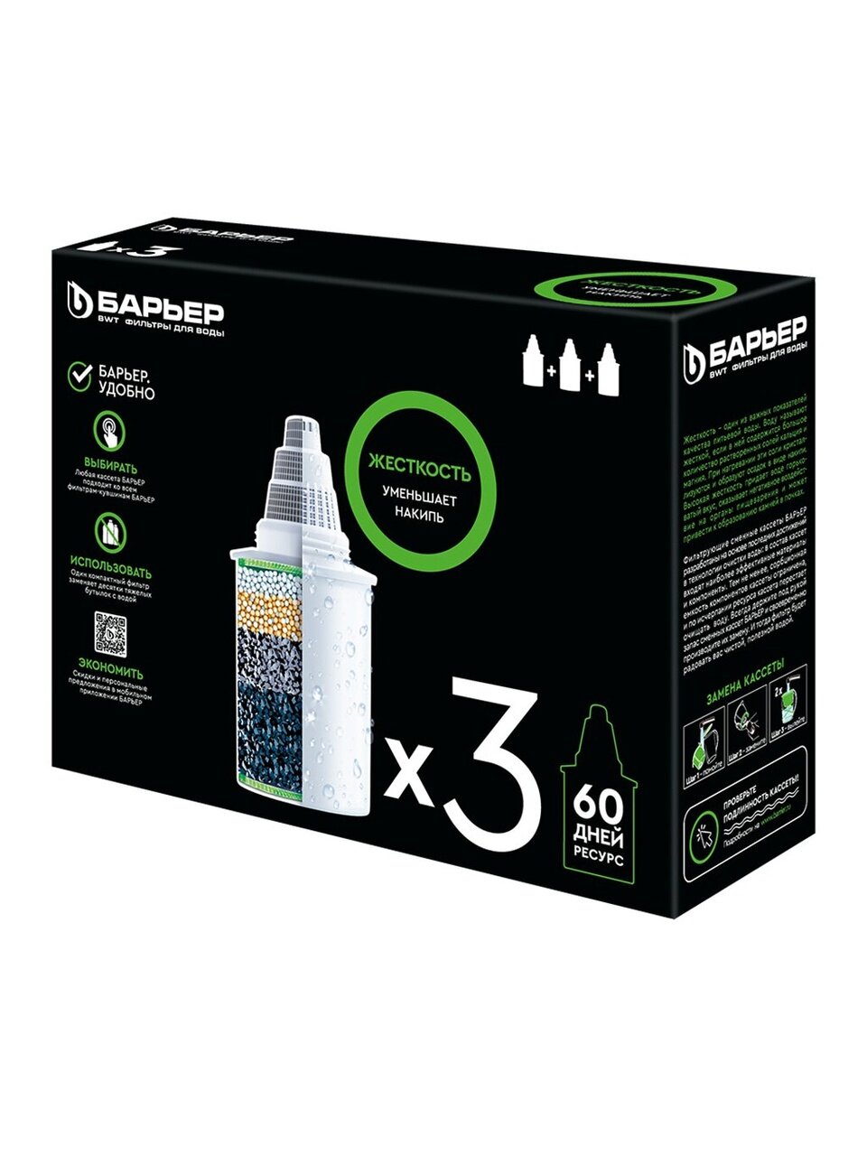 Сменный картридж Барьер прост и удобен в использовании. Его установка не займет у Вас много времени, а наслаждаться чистой, вкусной и полезной водой как из родника Вы сможете еще долго. С картриджем Барьер можно раз и навсегда забыть о накипи: он позаботится не только о Вашем здоровье, но и об окружающих Вас бытовых предметах: чайнике, утюге или кофемашине.