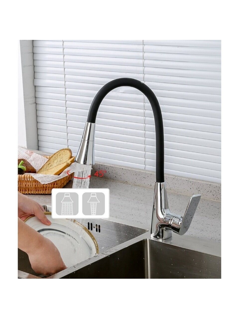 - Гибкий излив 21,4 см — удобно мыть посуду и наполнять даже большие кастрюли