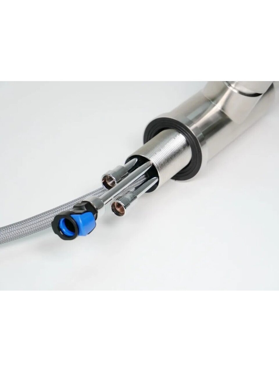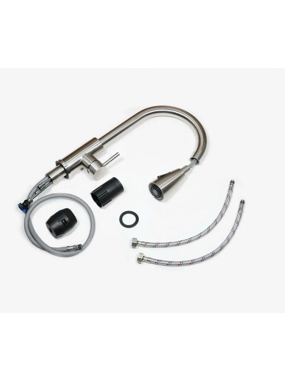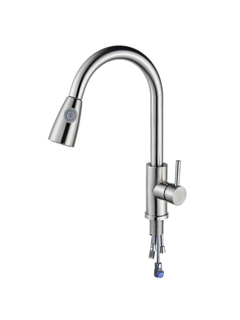Смеситель для кухни Potato P0046S с выдвижным изливом — стильное решение для экономии воды и удобства мытья посуды. Матовая нержавеющая сталь, гибкая подводка, простой монтаж.