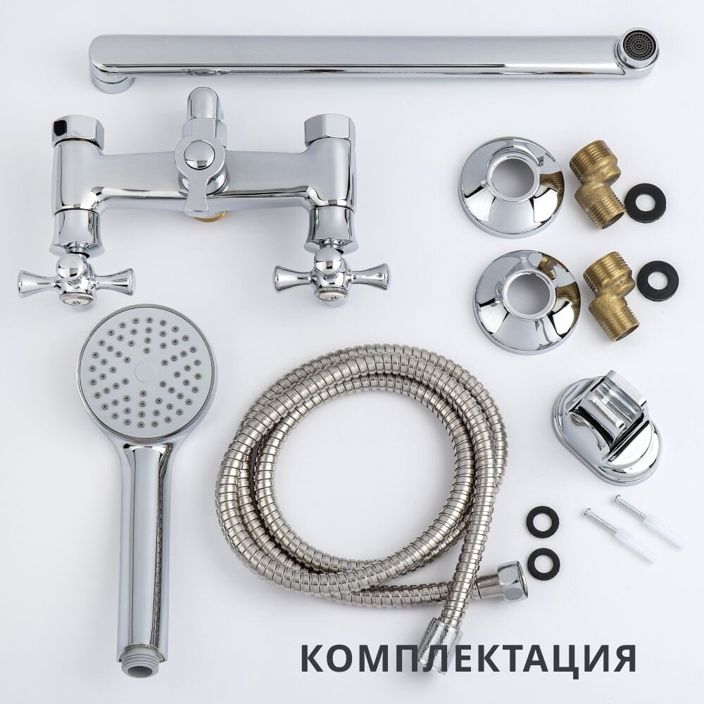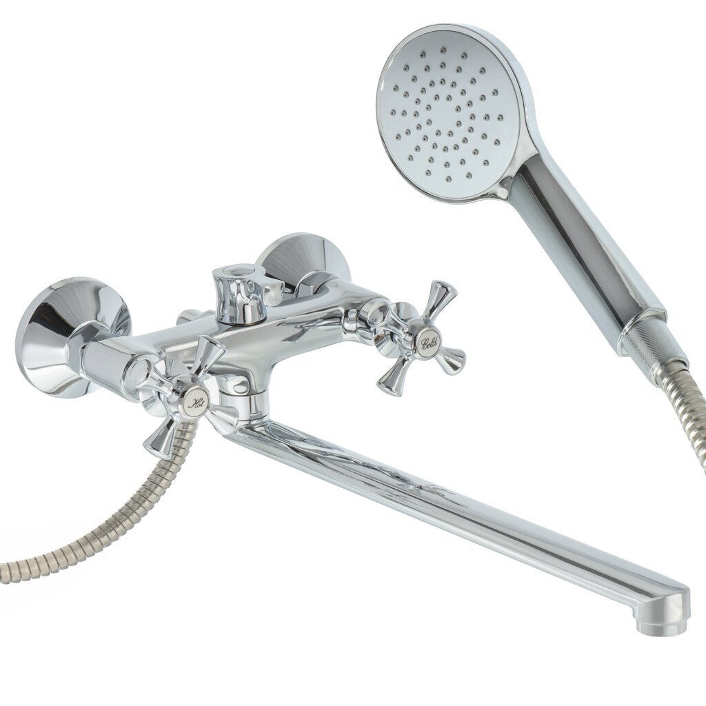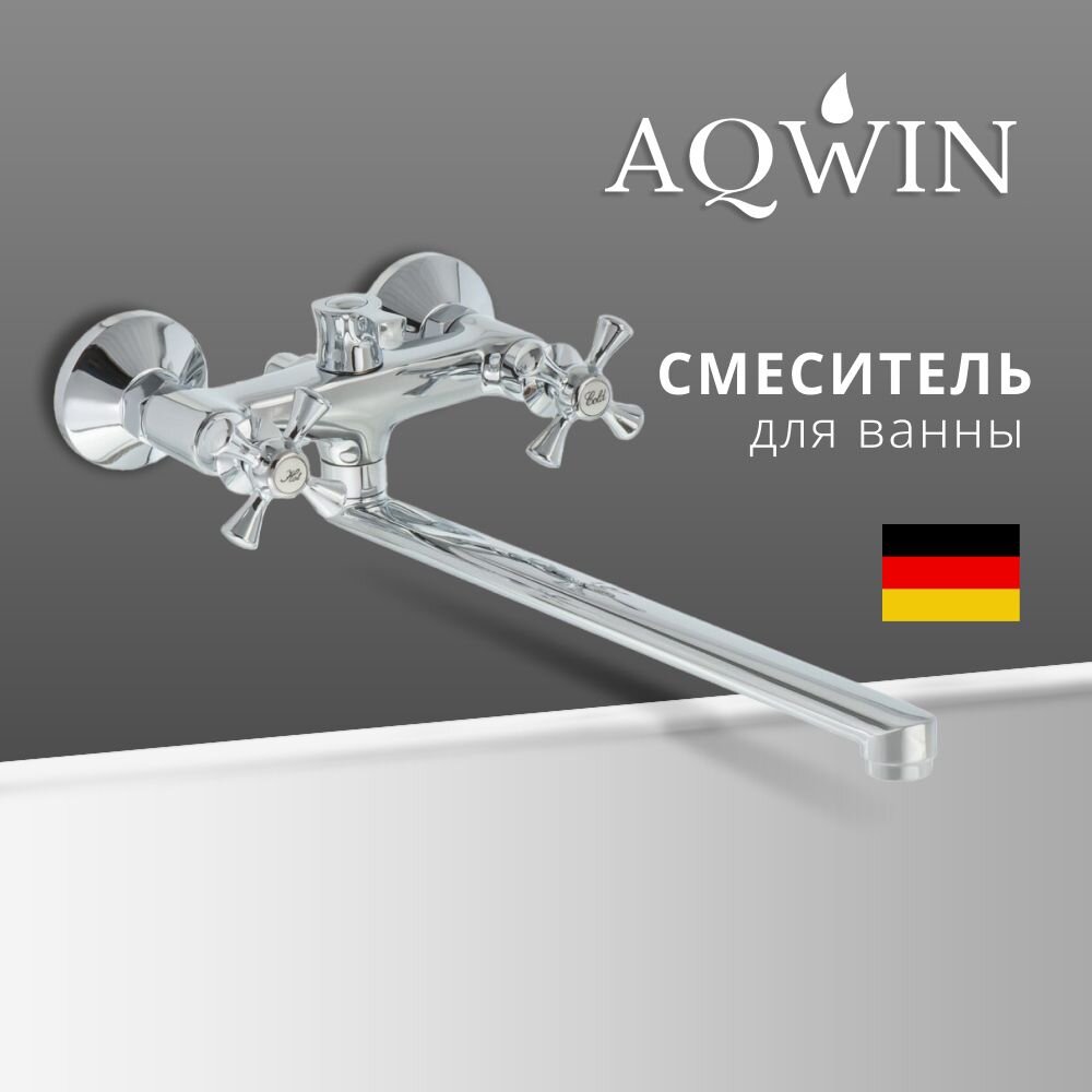 Смеситель для ванны Aqwin A2364 — долговечное решение для ванной: керамическая кран-букса, длинный поворотный излив 35 см, лейка и гибкий шланг.