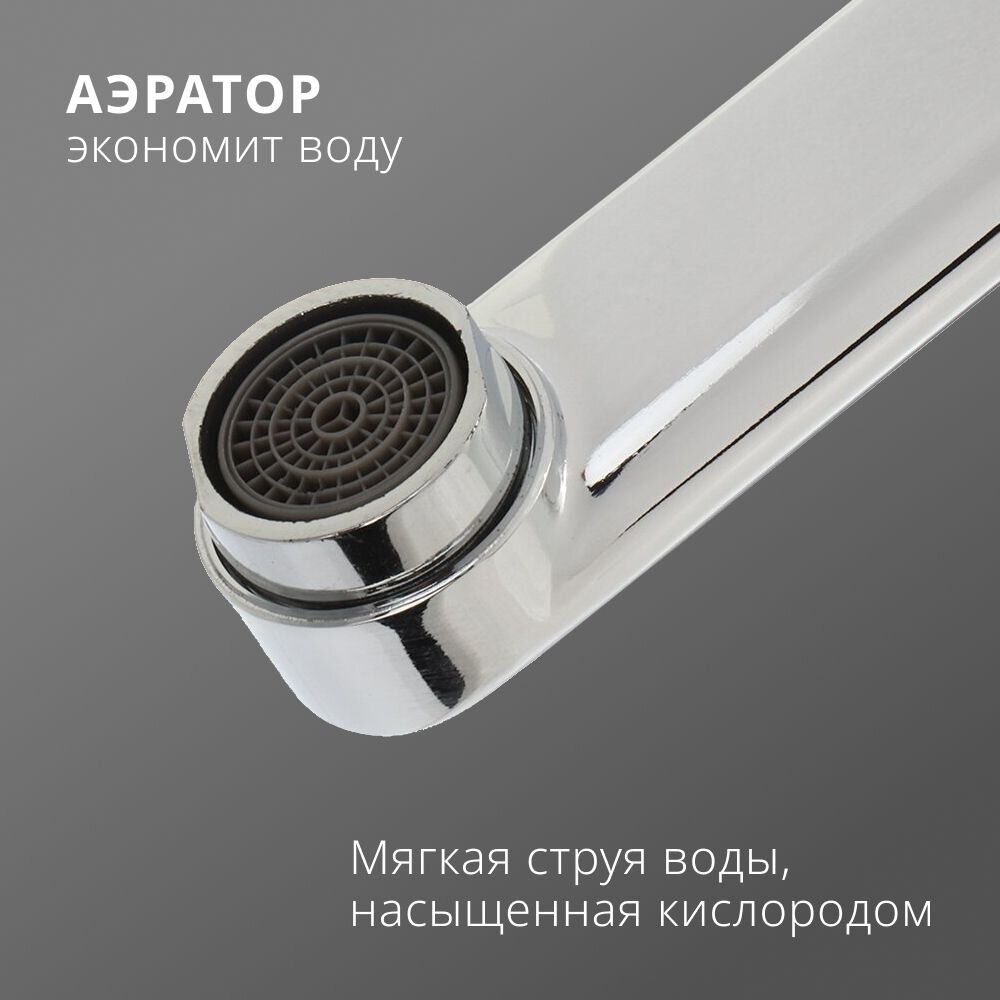 Смеситель оснащён двухвентильным поворотным механизмом управления с керамической кран-буксой, что обеспечивает плавную и точную регулировку воды.