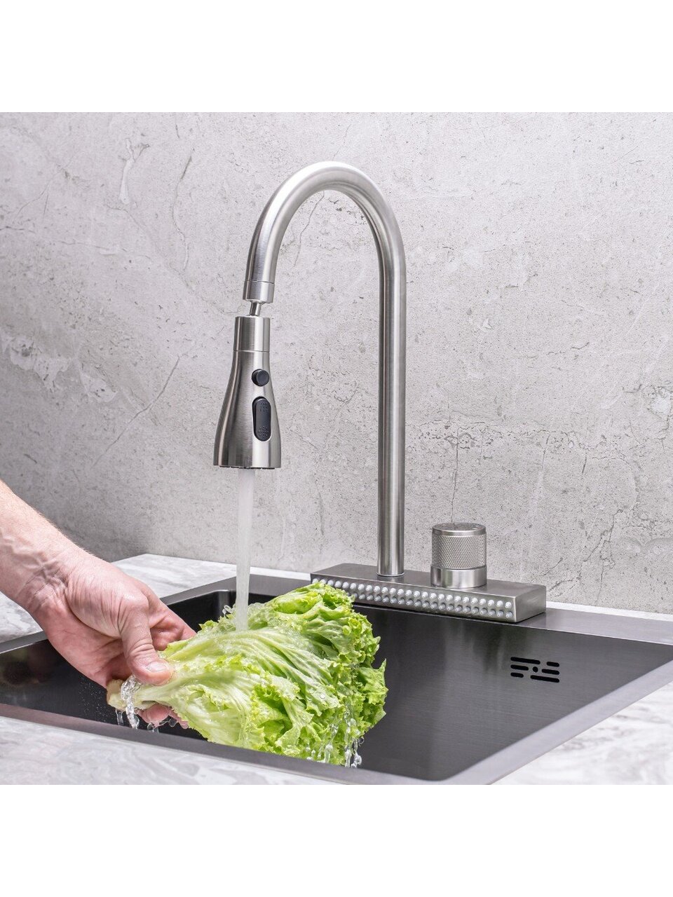 - С выдвижным аэратором — удобно мыть посуду и наполнять высокие ёмкости