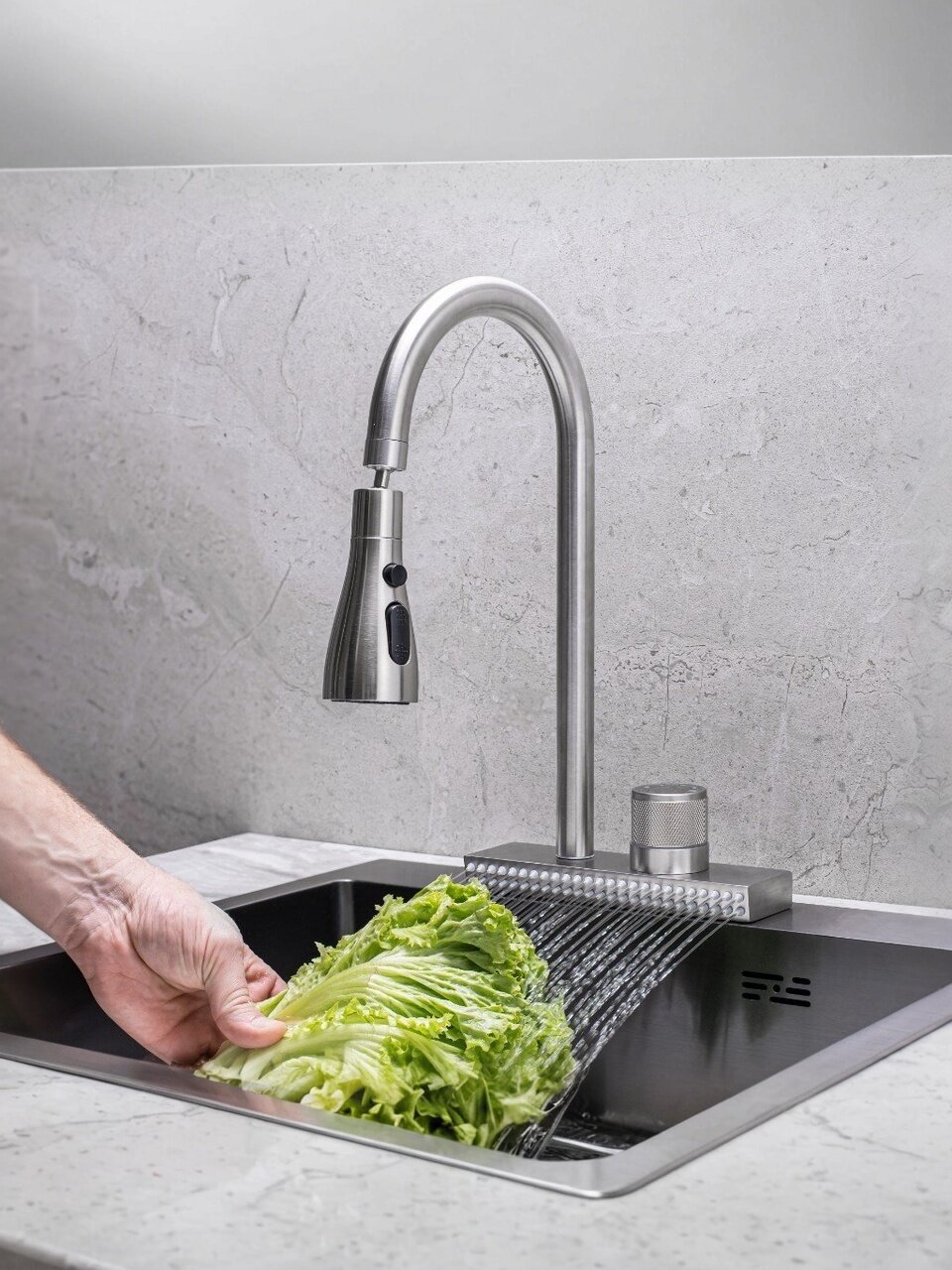 Часто спрашивают: «Какой смеситель лучше выбрать для кухни?» или «Чем отличается этот смеситель от моделей с пластиковым корпусом?». Данная модель не содержит пластиковых элементов, что делает её более прочной и долговечной. Благодаря выдвижному аэратору и гибкой подводке, смеситель удобен для мытья крупной посуды и овощей. Он подходит для установки на одну монтажную точку (отверстие 35 мм), что упрощает монтаж своими руками. В отличие от аналогов без аэратора, эта модель позволяет экономить воду и обеспечивает мягкую струю без брызг.