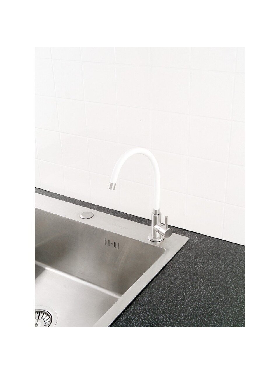 Гибкий излив позволяет легко менять угол подачи воды, мыть крупную посуду и наполнять высокие емкости, что особенно удобно при ежедневном использовании на кухне или даче.