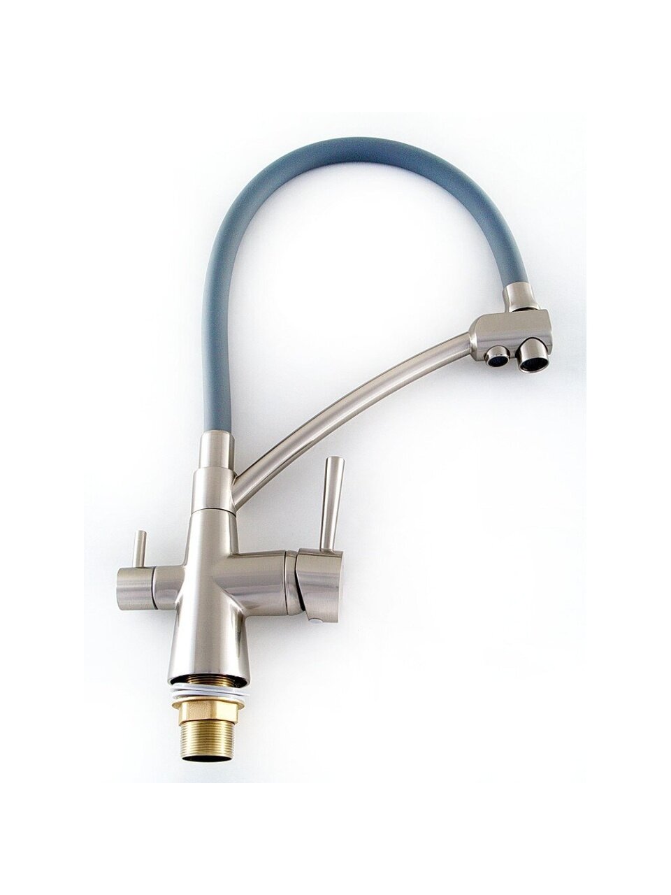Модель оснащена отдельным переключателем и каналом для фильтрованной воды. Подключение осуществляется через стандартный шланг 1/2", монтаж — в одно отверстие диаметром 35 мм.