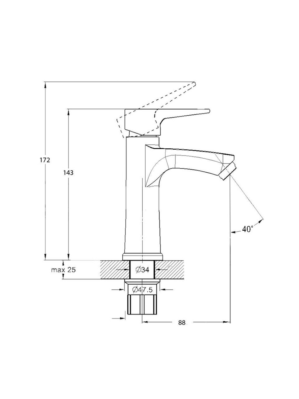 Горизонтальный монтаж через одно отверстие (34 мм), крепление гайкой, гибкая подводка со стандартом 1/2".