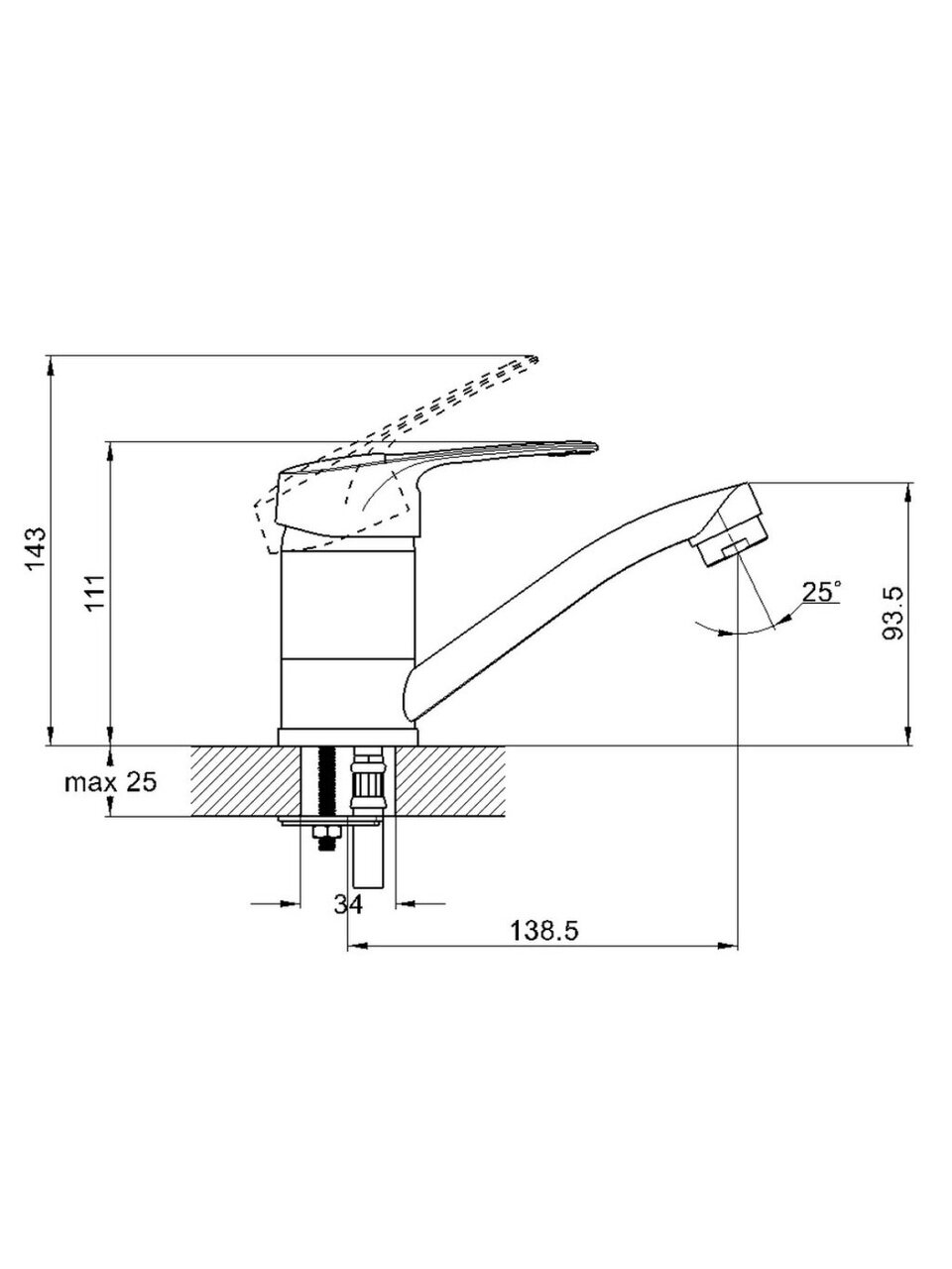 Смеситель устанавливается горизонтально через одно монтажное отверстие диаметром 34 мм, крепится шпилькой и подключается к стандартной подводке 1/2".