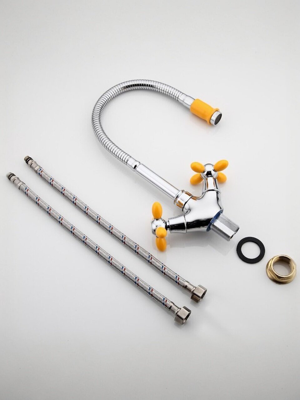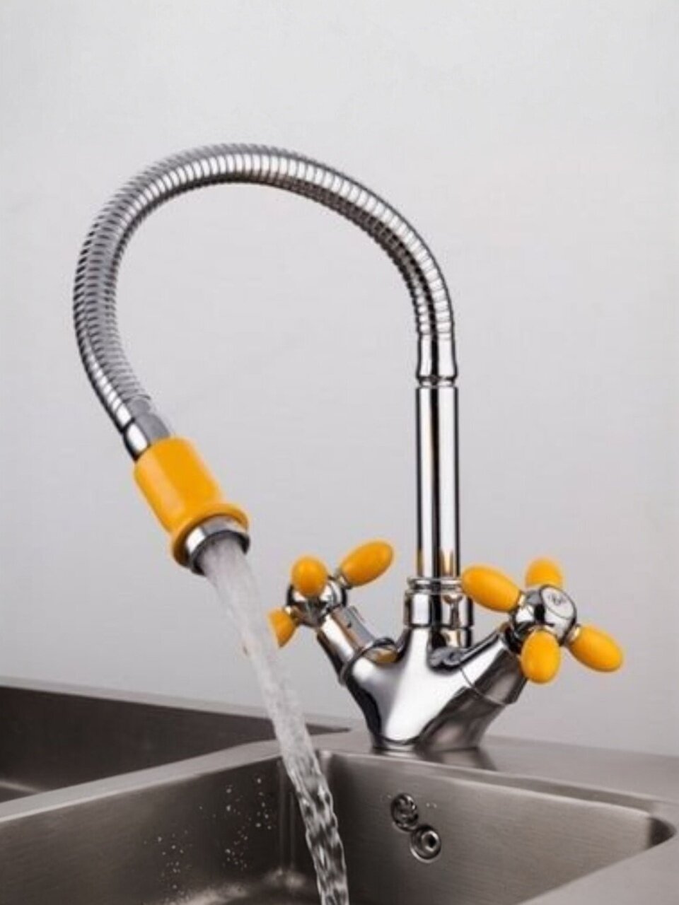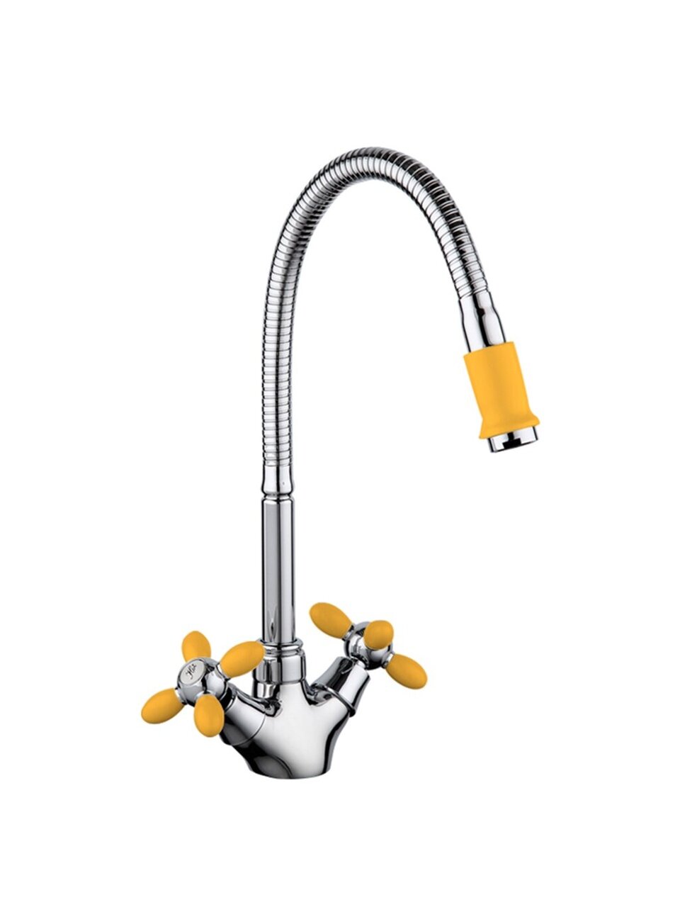 Смеситель для кухни Frud с гибким изливом, кран-буксой и глянцевым покрытием — стильное решение для современной кухни. Яркий желтый цвет, высокая износостойкость, монтаж за 10 минут.