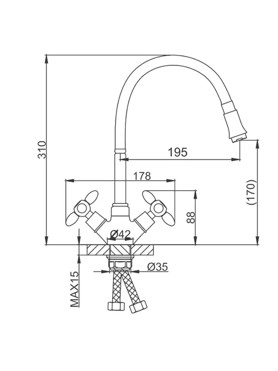 Для установки требуется одно монтажное отверстие диаметром 42 мм, стандарт подводки шланга — 1/2".
