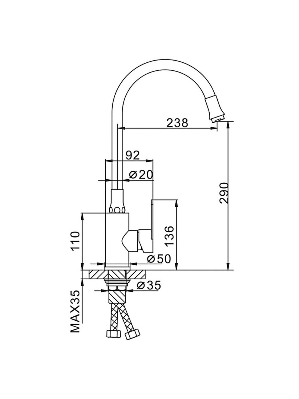 Для монтажа требуется одно отверстие диаметром 35 мм. Стандарт подключения шланга — 1/2".
