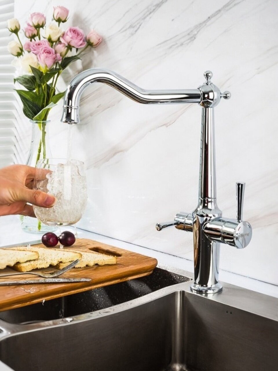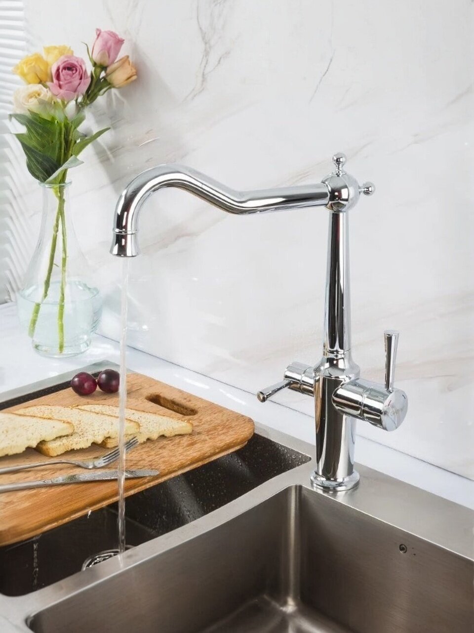 Модель оснащена отдельным переключателем и стандартной подводкой 1/2", что позволяет легко подключить фильтрационную систему без дополнительных переходников. Монтаж выполняется в одно отверстие диаметром 50 мм.