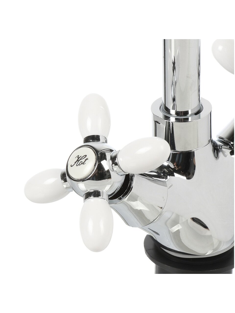 - Корпус из латуни, керамическая кран-букса, длина излива 40 см — надежность, устойчивость к коррозии, плавный ход вентилей