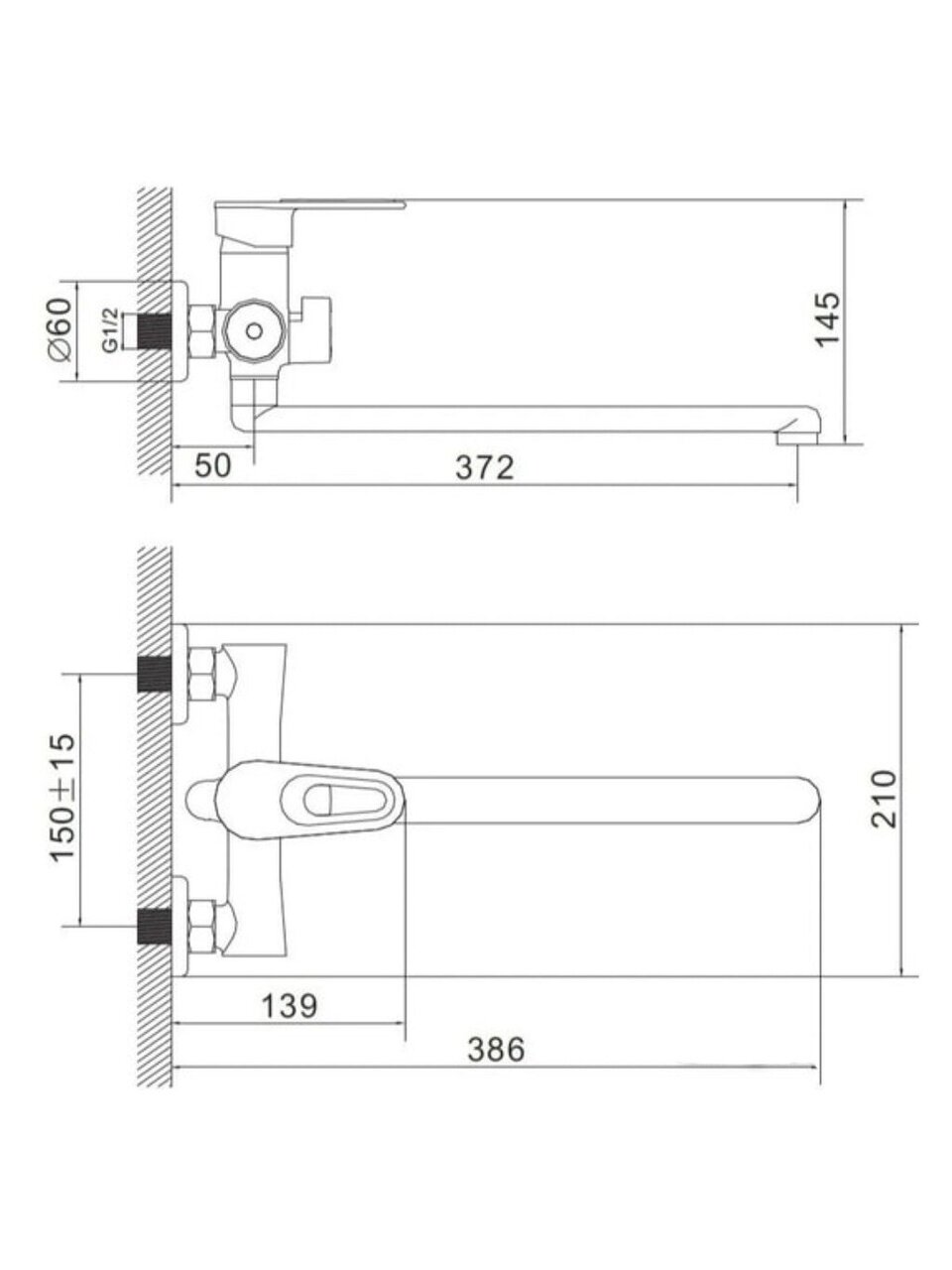 Вертикальный настенный монтаж, межосевое расстояние 150 мм, длина излива 32 см, крепление на 2 отверстия, стандарт подключения 1/2".