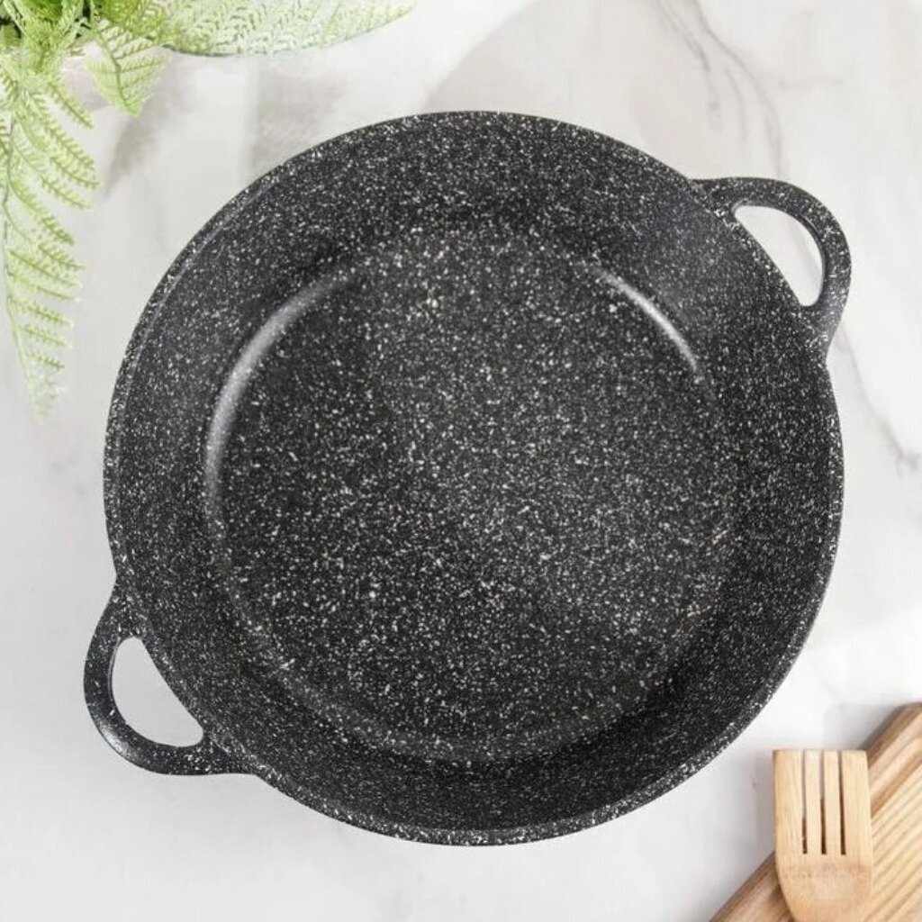 Также в ней можно приготовить плов рагу, жаркое или даже испечь пирог. «Гранит». Коллекция посуды с улучшенным четырёхслойным антипригарным покрытием. Дополнительный слой с мраморным эффектом увеличивает износостойкость и создаёт оригинальный оттенок чёрного мрамора. Литой пищевой алюминий не имеет канцерогенных веществ и посторонних запахов. Толстые стенки и дно обеспечивают равномерное приготовление блюда.