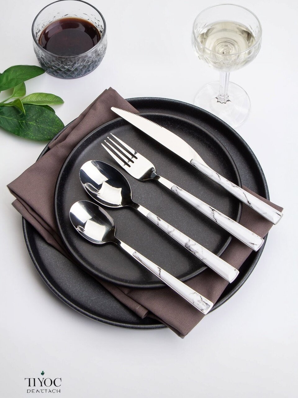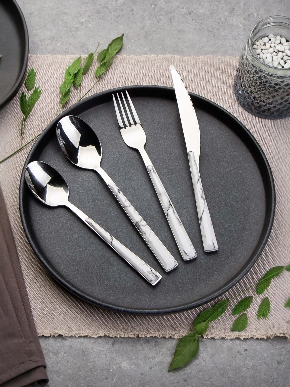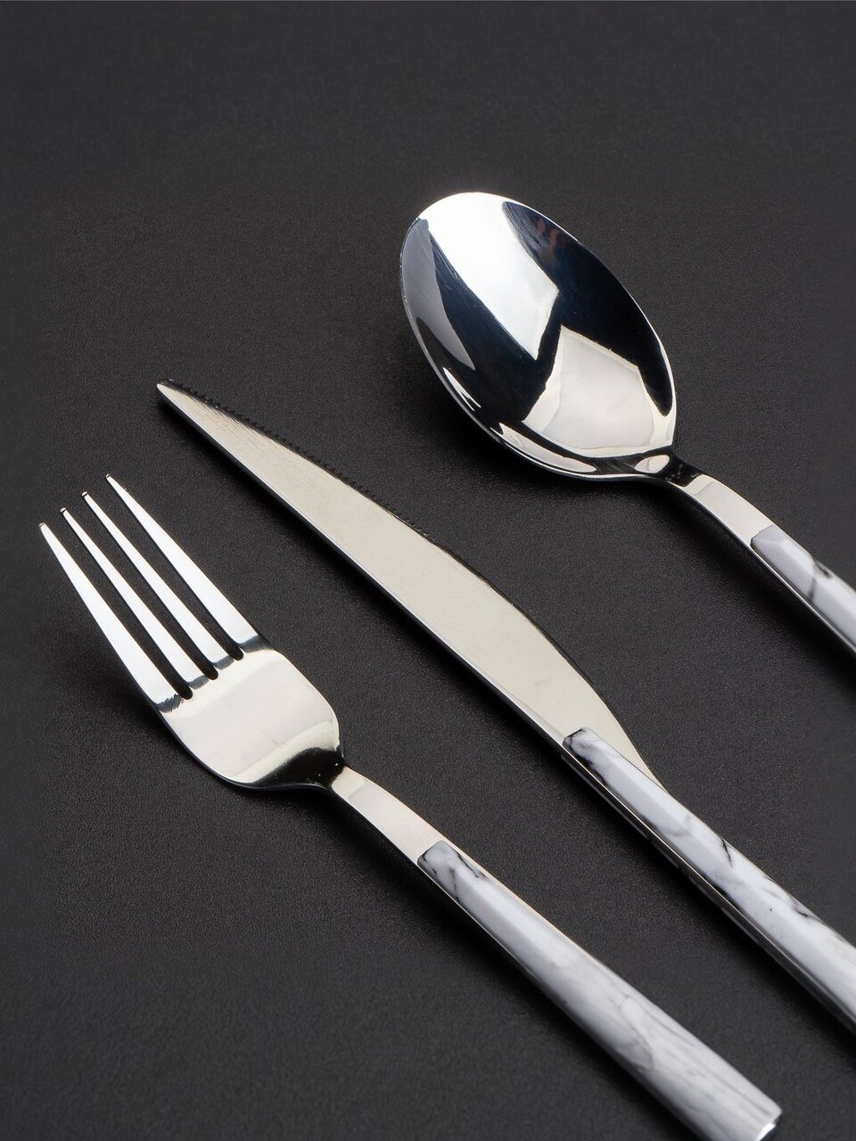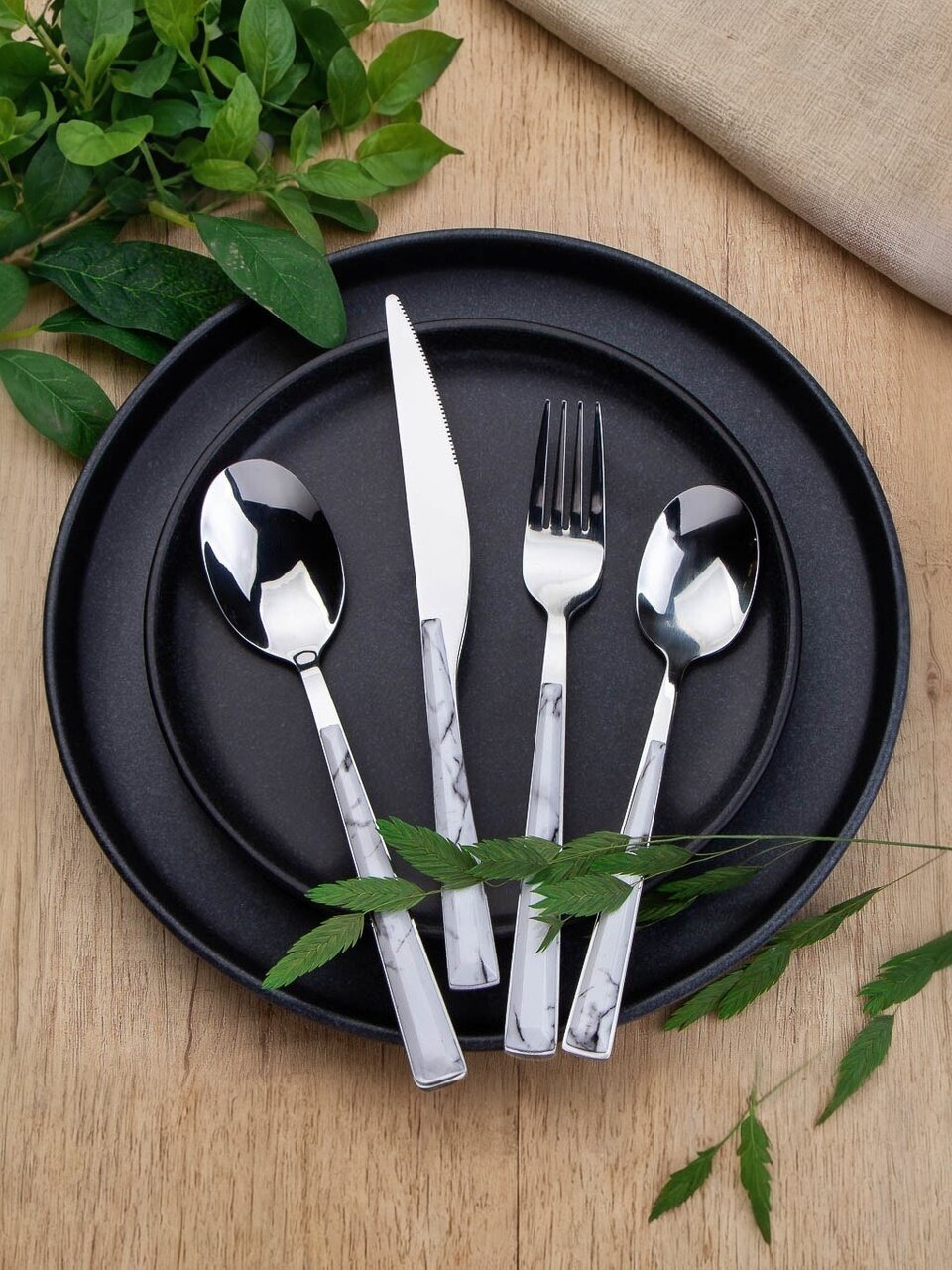 Этот набор столовых приборов сочетает в себе изысканную отделку под белый мрамор и современный глянцевый блеск. Благодаря сочетанию металла и пластика приборы легкие, но устойчивы к деформации. Если вы ищете, какой набор столовых приборов выбрать для дачи или дома, обратите внимание на этот вариант: он отлично подходит для сервировки на 6 человек и не требует сложного ухода.