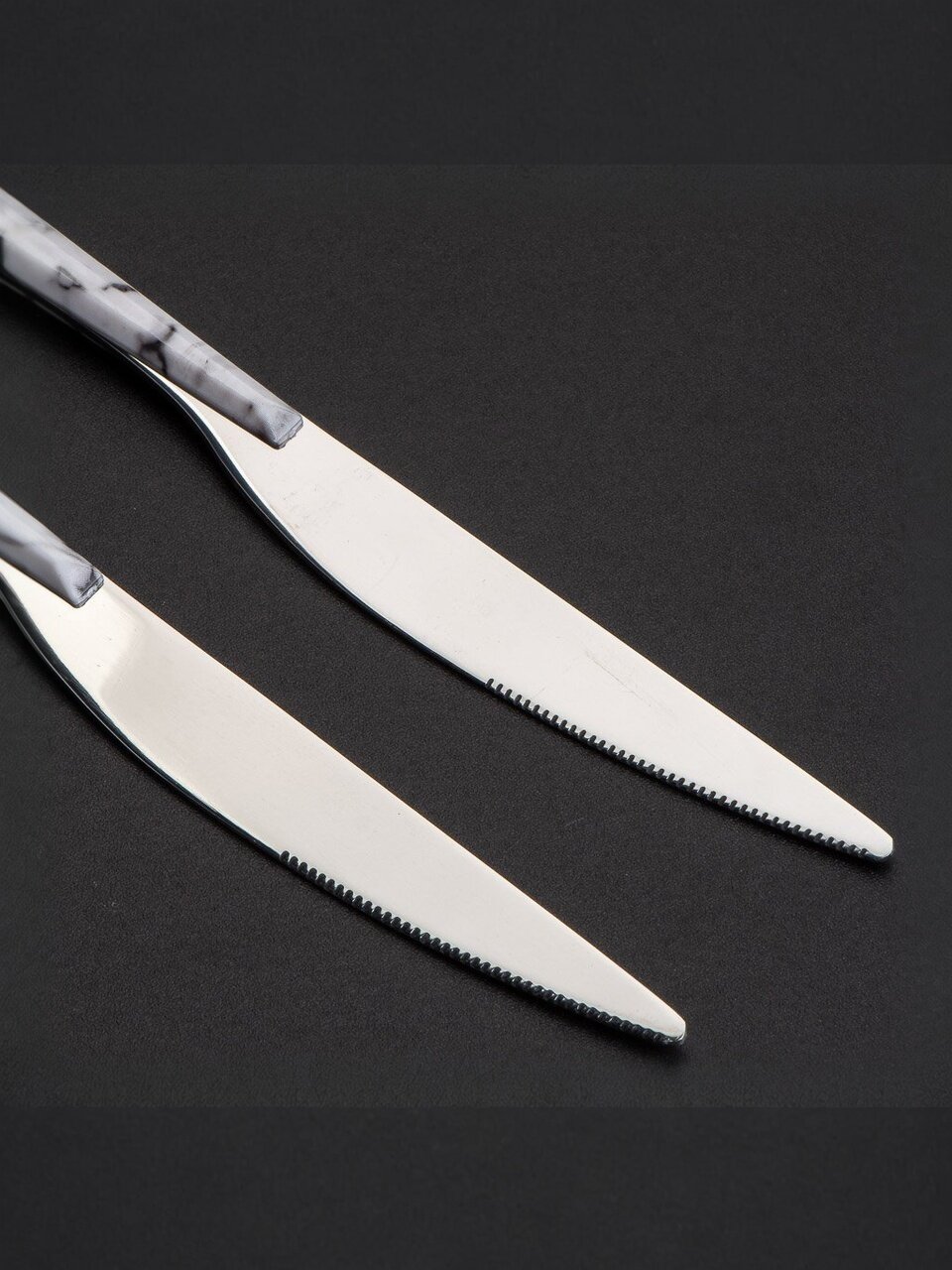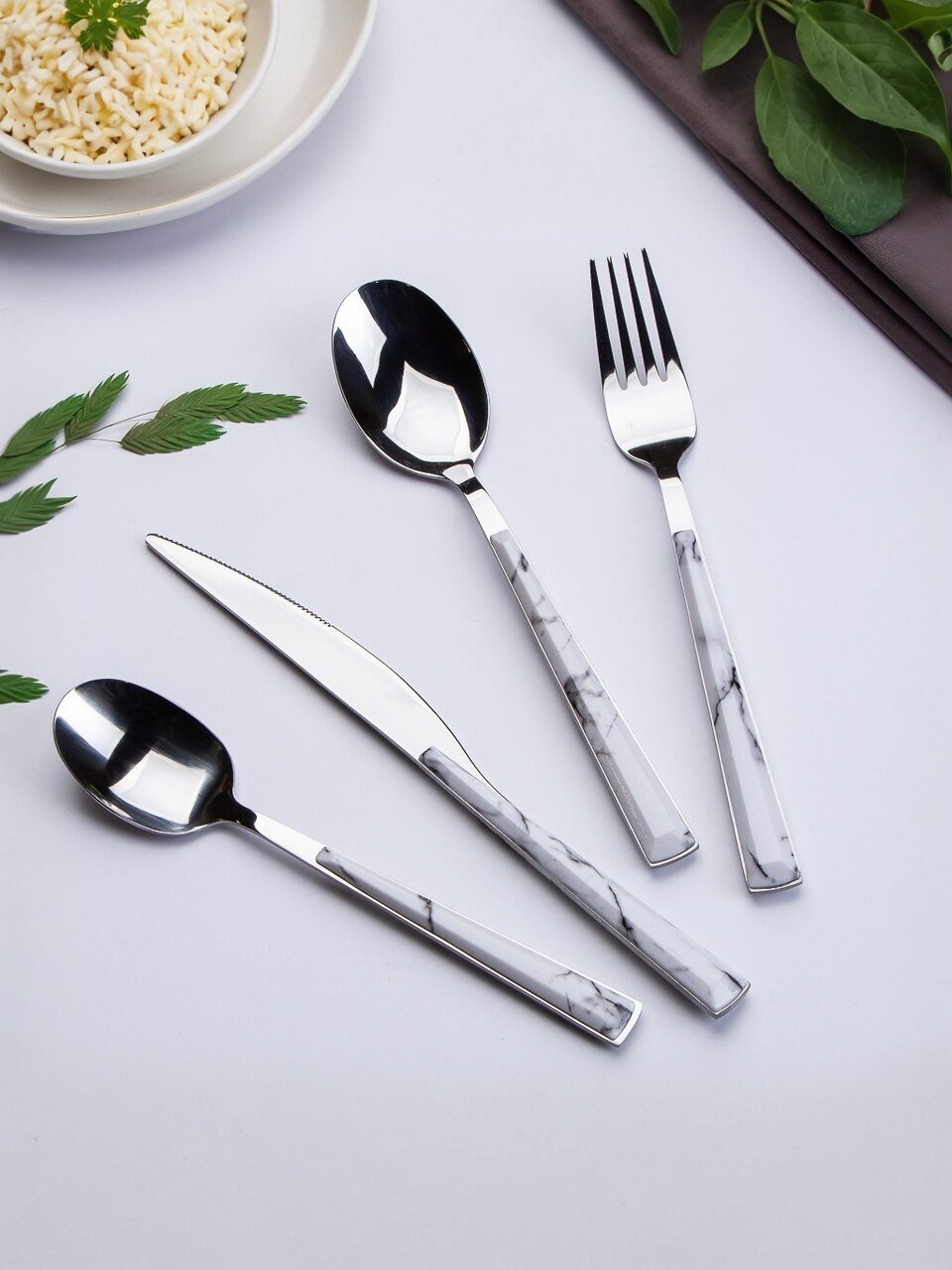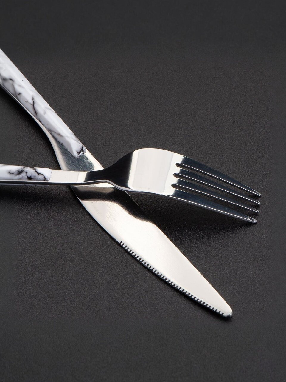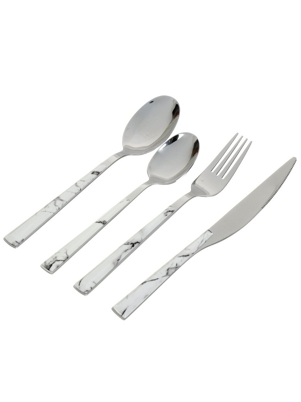 Этот набор столовых приборов сочетает в себе изысканную отделку под белый мрамор и современный глянцевый блеск. Благодаря сочетанию металла и пластика приборы легкие, но устойчивы к деформации. Если вы ищете, какой набор столовых приборов выбрать для дачи или дома, обратите внимание на этот вариант: он отлично подходит для сервировки на 6 человек и не требует сложного ухода.