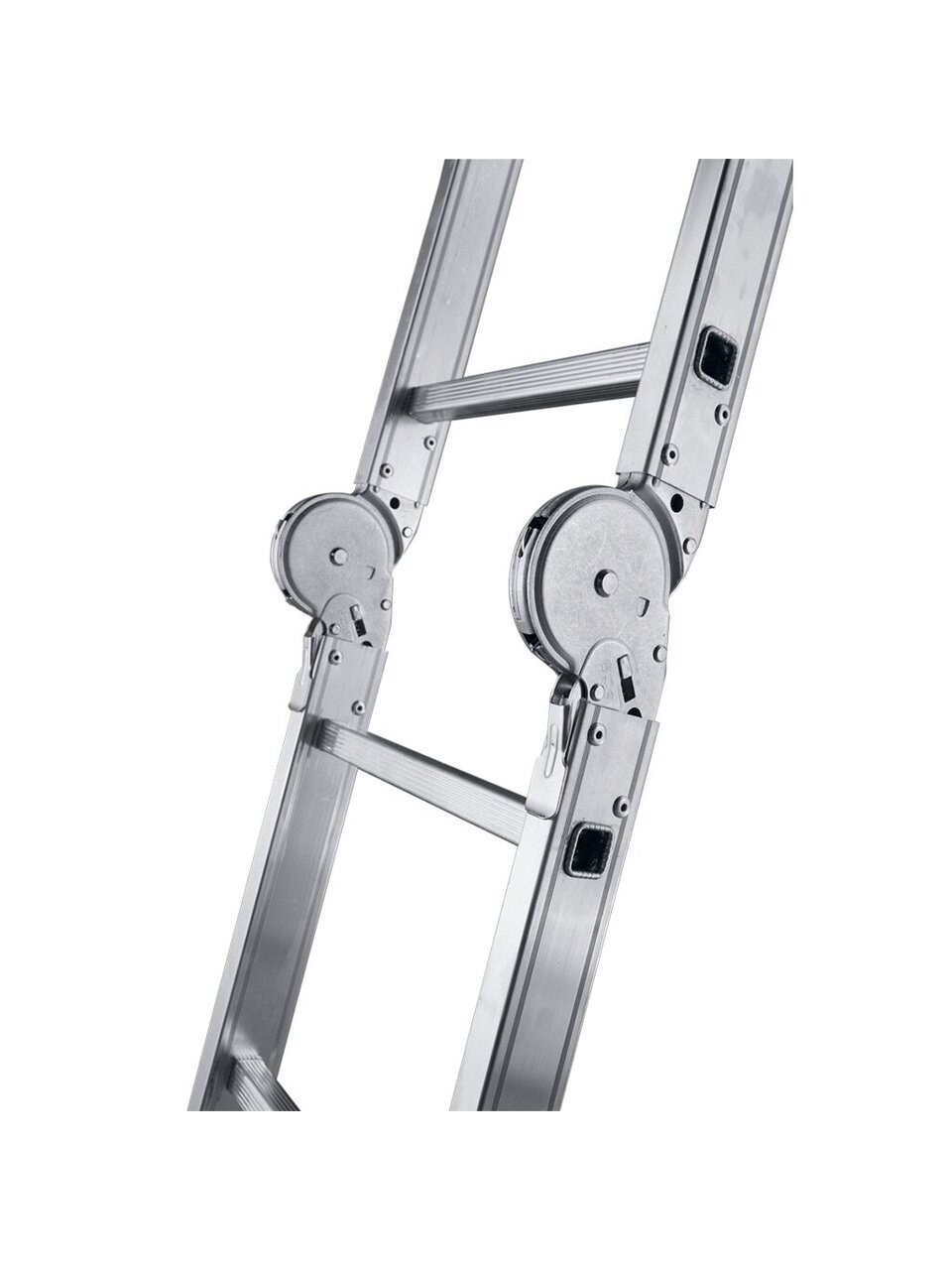 Лестница-трансформер — это шарнирная лестница, состоящая из отдельных секций, соединенных между собой шарнирными замками. Каждый шарнир позволяет фиксировать различный угол между секциями. Это позволяет использовать лестницу-трансформер во многих модификациях: приставная лестница, стремянка, помост, консольная лестница и многое другое. Шарнирная лестница может складываться в 4 раза, что придает ей очень компактные размеры. При одинаковой длине в приставном виде шарнирная лестница в сложенном виде будет всегда намного компактней, чем трехсекционная универсальная лестница. Даже самая большая лестница-трансформер влезает в багажник легкового автомобиля.