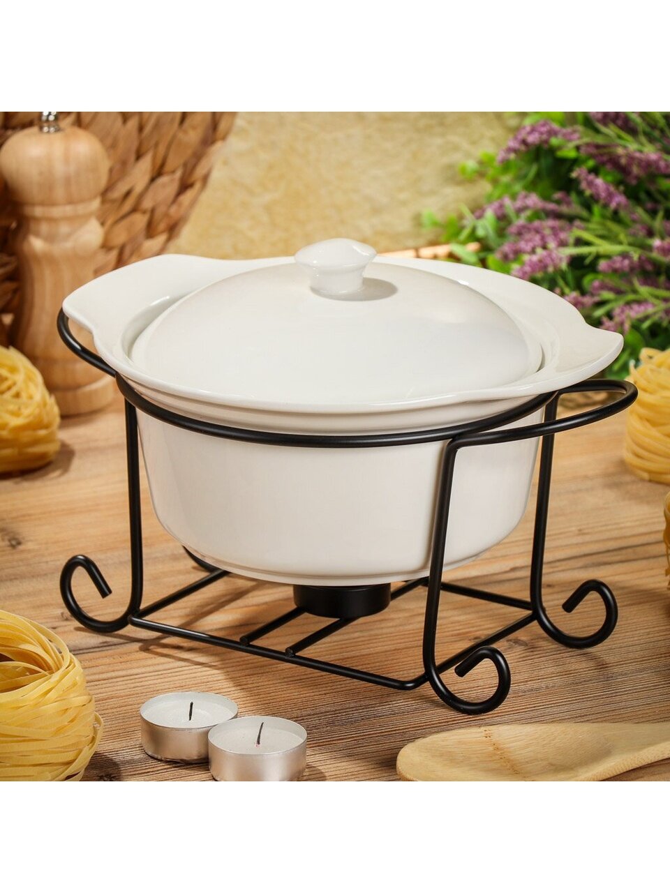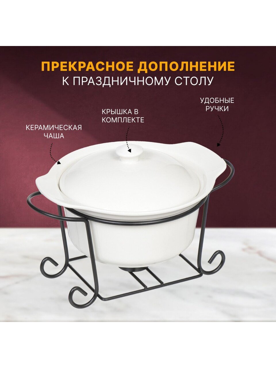 Мармит выполнен из керамики белого цвета. Керамическая чаша с удобными ручками располагается на стальной подставке с одним подсвечником для чайных свечей (не входят в комплект). Свеча устанавливается на подставку, нагревает чашу снизу, таким образом поддерживая нужную температуру приготовленного блюда. Крышка прикрывает чашу сверху, не давая остыть блюду. Благодаря своему элегантному дизайну, мармит с приготовленным блюдом можно сразу подавать на стол, не перекладывая еду на сервировочные тарелки. Изящный, с современным дизайном, мармит украсит любой праздничный стол, а блюда в нем будут всегда теплыми и ароматными.