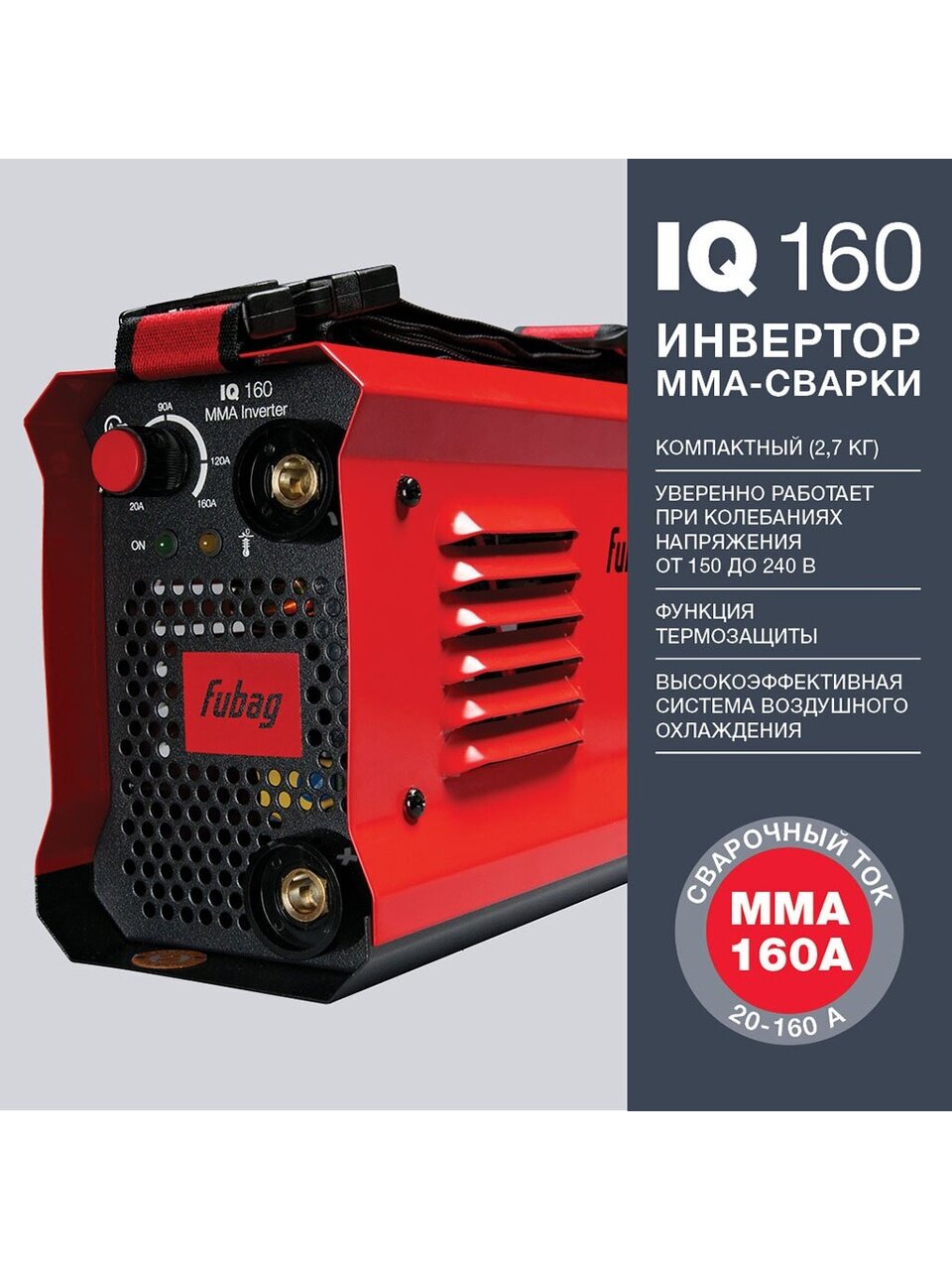 FUBAG IQ 160 – компактный и легкий сварочный инвертор Fubag, обеспечивающий ровный сварной шов при работе от сети с напряжением 150-240 В. Сварочный аппарат IQ 160 оснащен функциями Arc Force, Hot Start, Anti Stick и позволяет проводить периодические сварочные работы на небольшом производстве, дома или на даче. Модель отличается небольшими габаритами и весом и не создает неудобств при хранении и транспортировке.