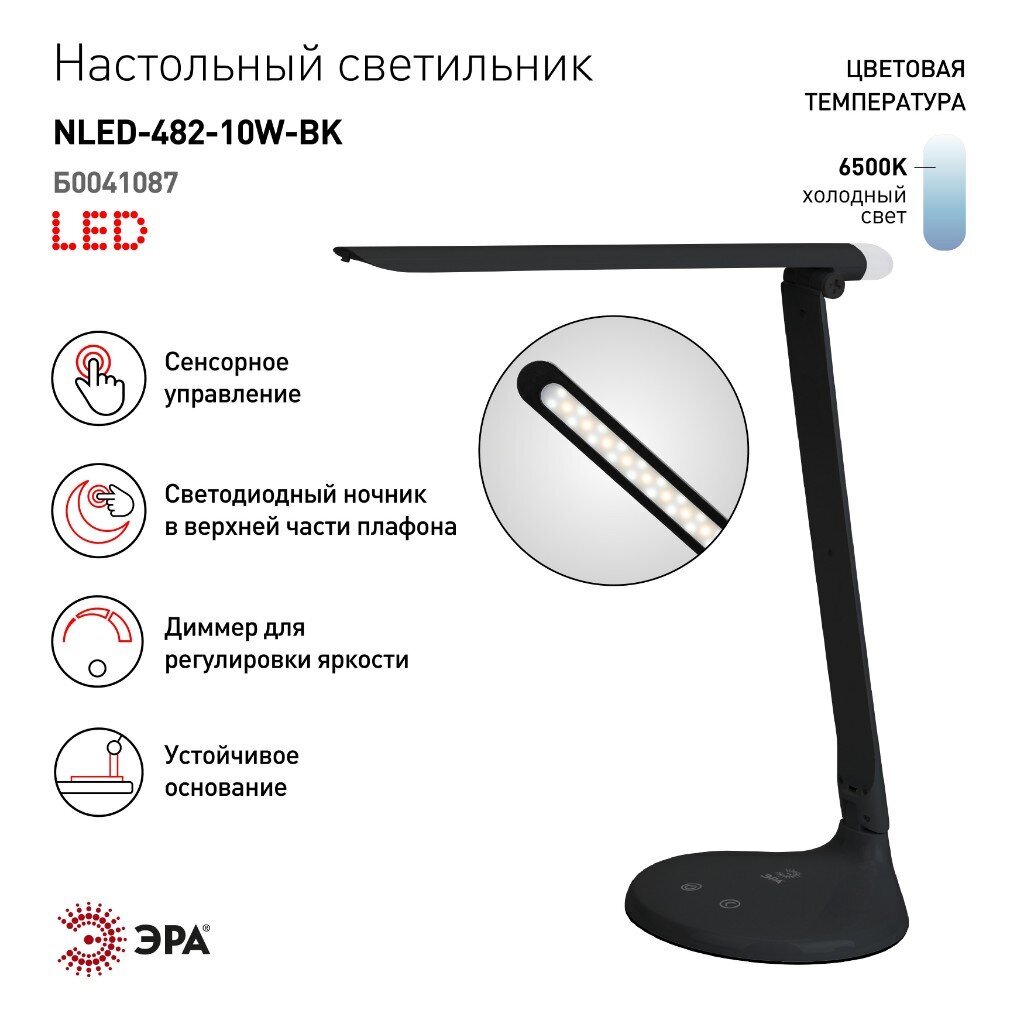Настольный светильник ЭРА NLED-482-10W-BK - удобная складная модель с сенсорным управлением, с тремя уровнями яркости и светодиодным ночником в верхней части плафона. Светит холодным белым светом, который бодрит и повышает работоспособность. Ночник в верхней части плафона имеет отдельный сенсорный выключатель на основании.
