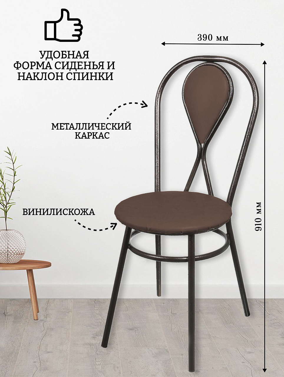 - Премиальные материалы: каркас из металла выдерживает ежедневные нагрузки, обивка из винилискожи устойчива к износу и легко очищается, размеры 390х390х910 мм подходят для большинства столов.