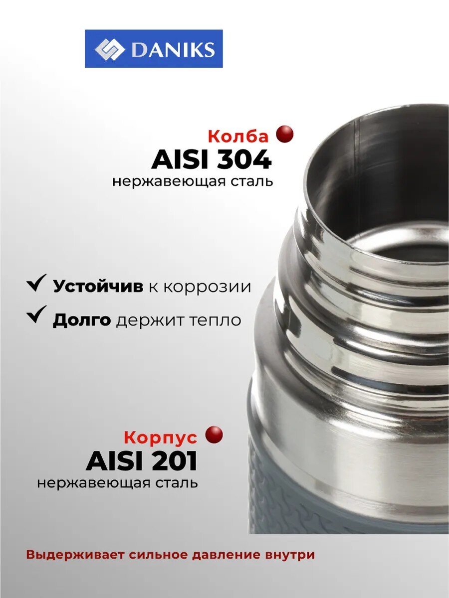 Термос Daniks на 1 литр — оптимальный выбор для тех, кто ищет, какой термос лучше купить для дома, работы или путешествий. Благодаря универсальной горловине с клапаном его легко наполнять и мыть, а вместимость 1 л позволяет брать с собой горячий чай или холодную воду на целый день. Корпус и колба выполнены из нержавеющей стали, что гарантирует долгий срок службы и устойчивость к ударам.