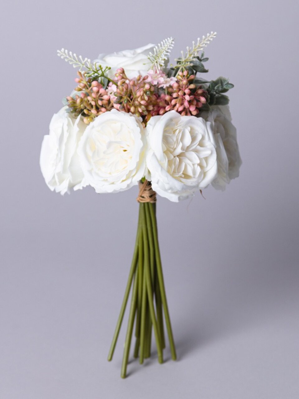 Высота букета составляет 26 см — это компактный вариант, который удобно размещать в вазах стандартного размера или использовать для декора стола, полок, фотозон.