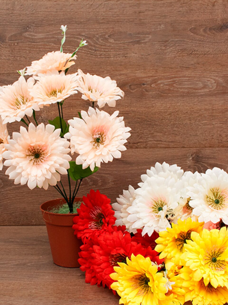 Искусственный декоративный пасхальный букет герберы высотой 40 см — это идеальное решение для тех, кто ищет, какой искусственный цветок выбрать для украшения интерьера или праздничного стола. Семь пышных головок герберы из современных материалов (пластмасса и текстиль) выглядят натурально, не требуют полива и бережно сохраняют форму даже при размещении на балконе или в ванной. Благодаря компактному размеру букет гармонично впишется в интерьер любой комнаты: гостиной, кухни, спальни, прихожей или офиса.