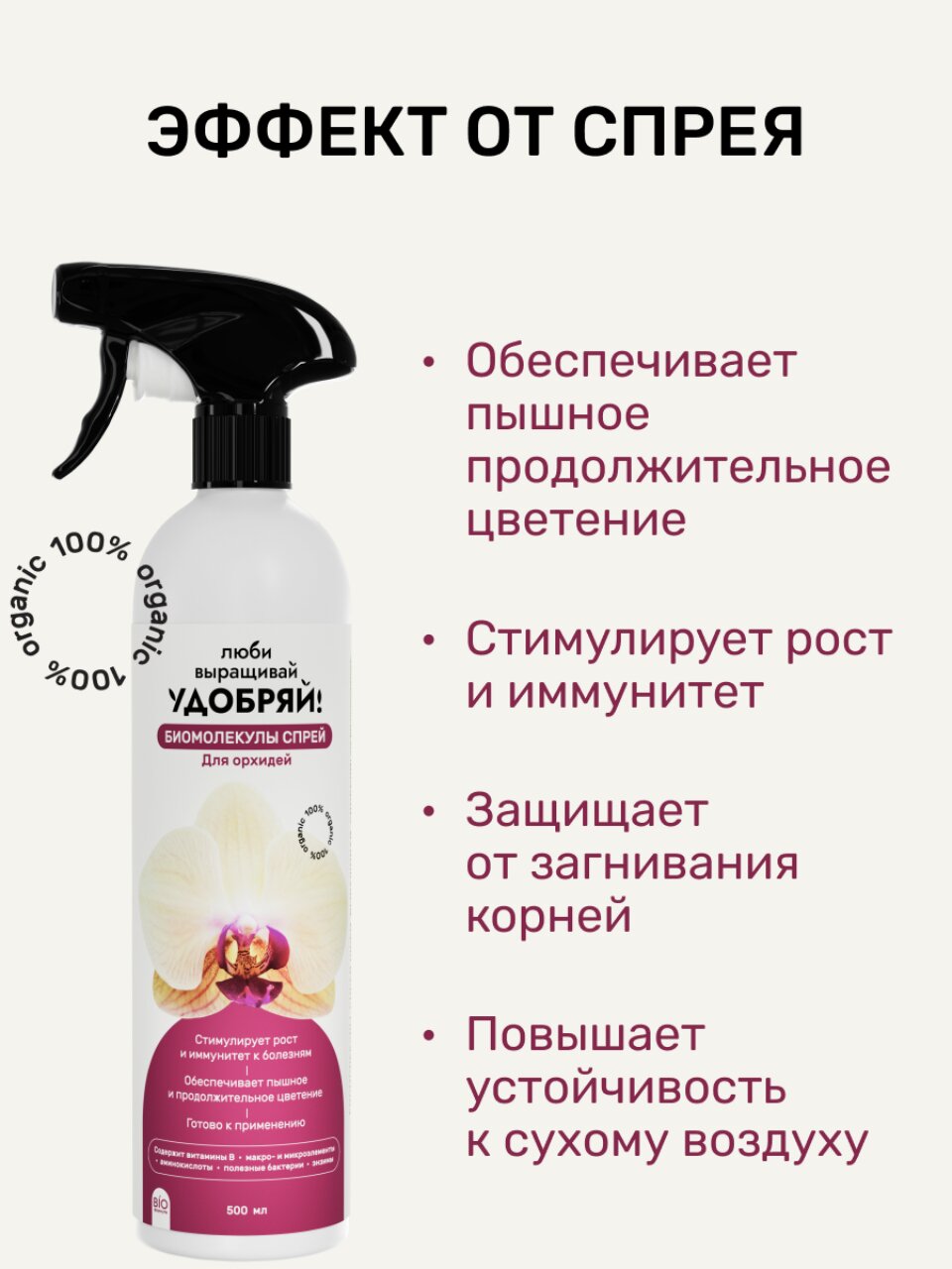 Органический спрей Биомолекулы мягко стимулирует рост, не вызывает ожогов корней и подходит для регулярного ухода — это особенно важно для домашних и комнатных орхидей.
