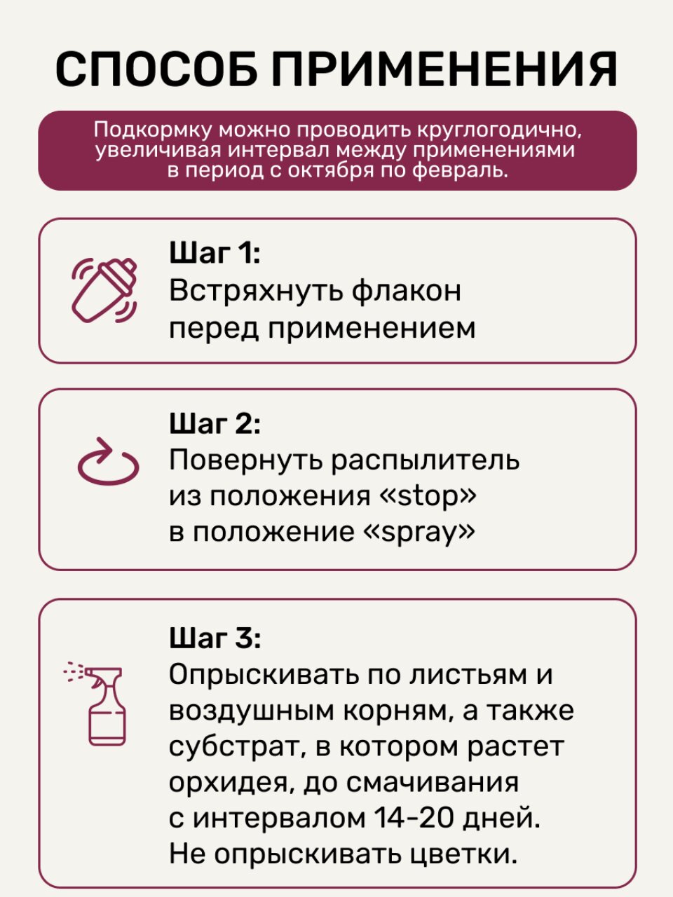 Рекомендуется использовать весной, летом и осенью — именно в эти периоды орхидеи наиболее активно растут и нуждаются в поддержке.