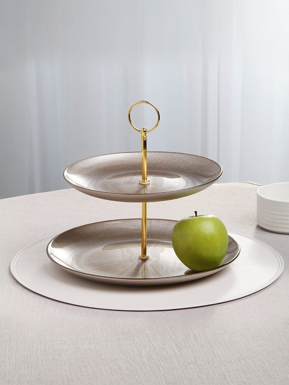 - Двухъярусная конструкция: экономит место и эффектно презентует фрукты, сладости или выпечку