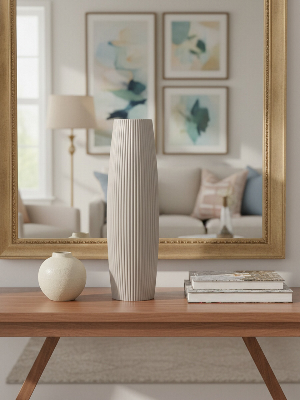 Оптимальная высота 45 см позволяет использовать вазу для длинных сухих веток, злаков, pampas grass и декоративных композиций. Узкое горло удерживает даже небольшое количество стеблей.