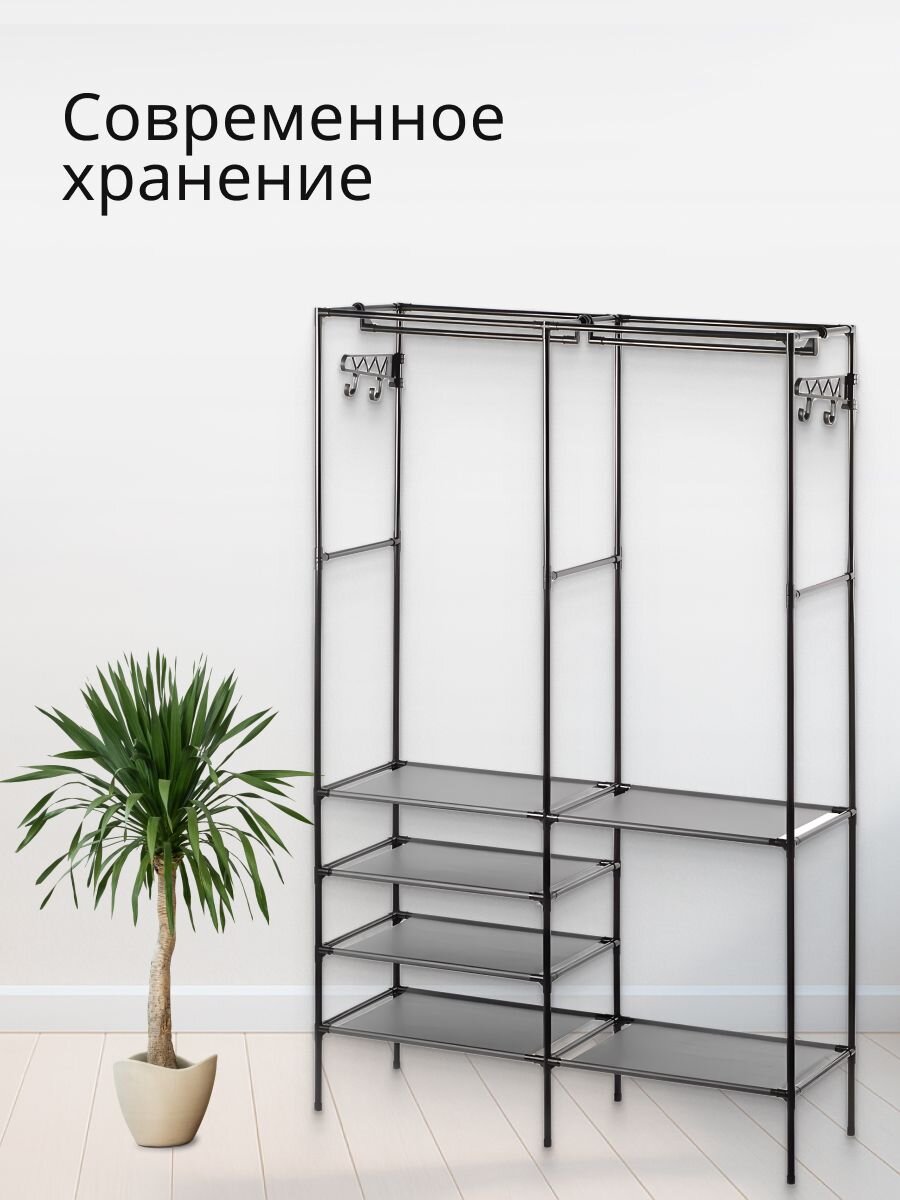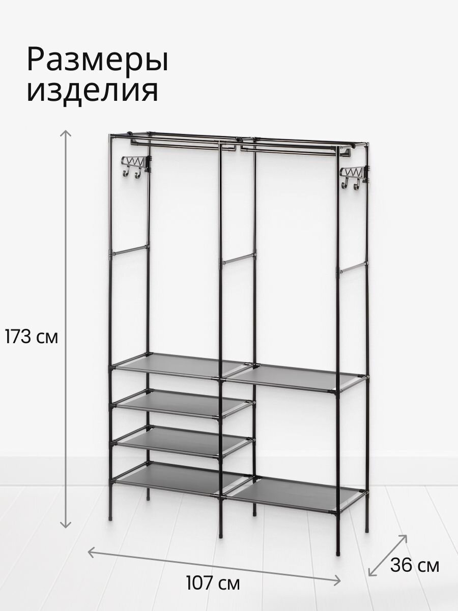 - Прочная металлическая рама (107х36х173 см): выдерживает сезонную верхнюю одежду, обувь, аксессуары