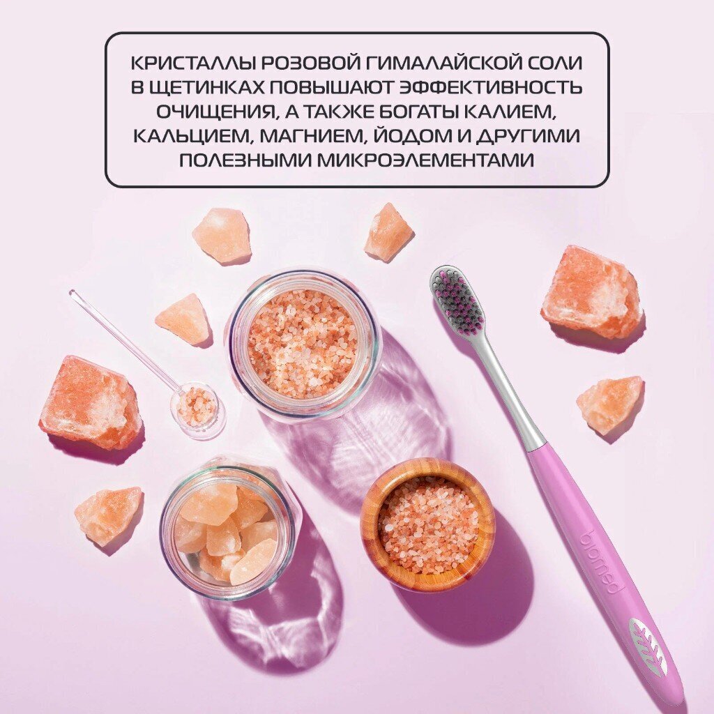 Мягкая зубная щетка Biomed идеально подходит для бережного удаления налета от кофе и табака, профилактики образований зубного камня. Щетина с гималайской розовой солью эффективно очищает зубной налет. Специальная форма головки обеспечивает легкий и быстрый доступ к жевательным зубам.